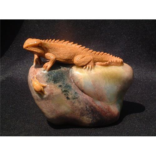 20th. century stone natural polychrome carving featuring a very realistic lizzard climbed on a green rock. A crab is also climbed on the rock and facing the lizzard. The artist exploited the different colors of the stone for a perfect, naturalistic rendition. Housed in a custom made box. Size: length" 4.8" X 4.2" ((12 cm. X 11 cm.).