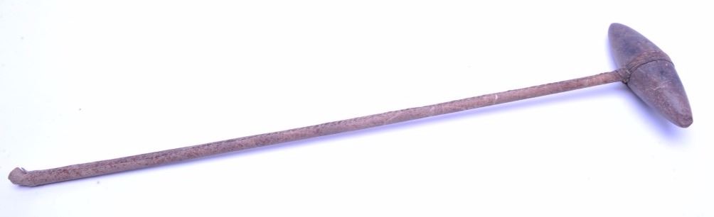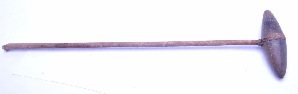 Stone war club with wrapped and tanned rawhide attachment and shaft. Measures 25” overall with a 6 ¼” stone head. Possible Cheyenne and 19th century of the type known as skull crusher. In good to very goodcondition. Est.: $200-$400
