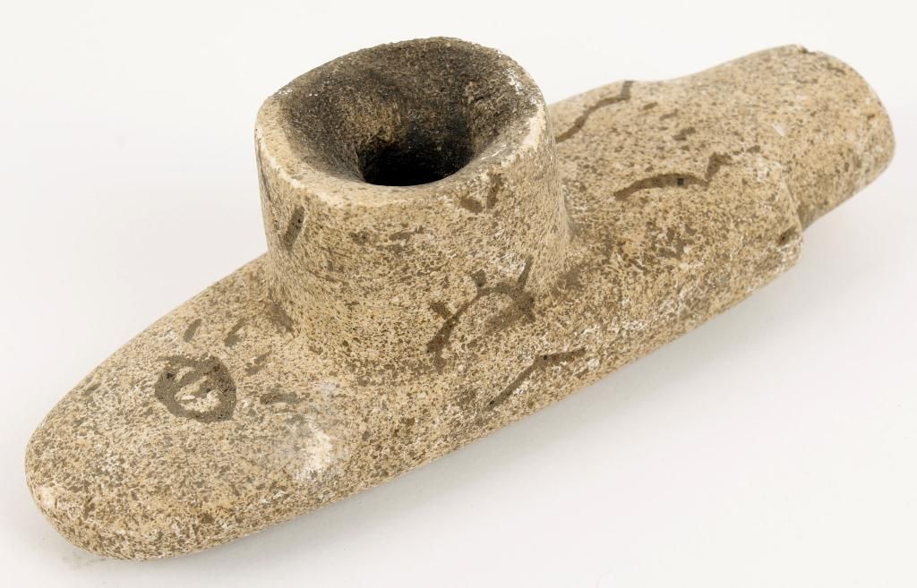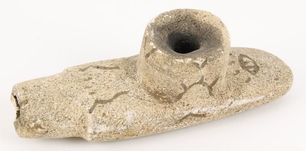 Measures 5 1/2"x2", mound builder culture, Circa 800-1450, in good condition with a crack, from the Mid West. Includes certificate of authenticity.
