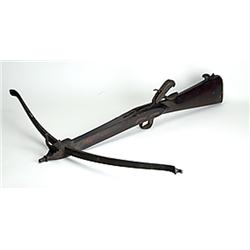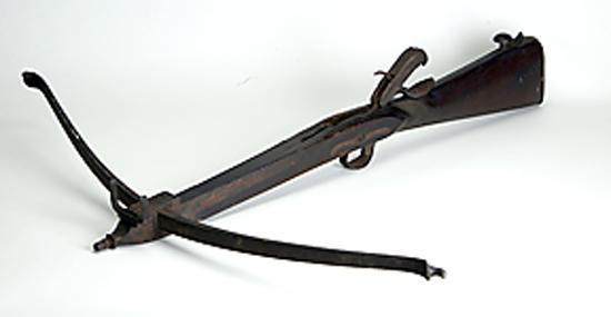Stonebow - Late 17th or Early 18th Century. Made of wood and iron, 28¾ in. long. The bow is 27½ in. across. Strings not present. Stonebows were most popular between 1760 and 1810. They were used for sport and not combat. Both men and women used them to kill small game animals, such as rabbits and birds, and also for target practice. They were first used in the 14th or 15th century. Unlike the crossbow, the stonebow is curved downward at the tiller.