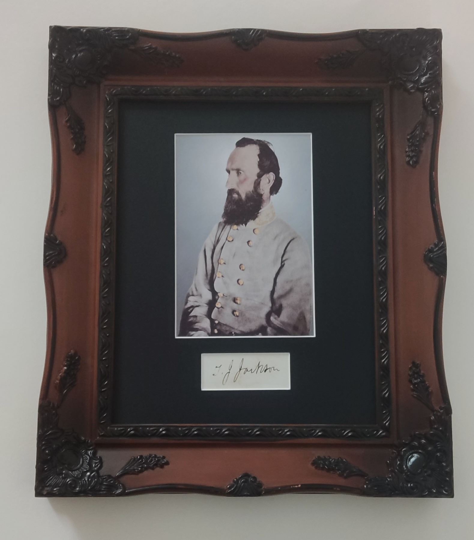 A signature from Stonewall Jackson measuring 2 x 1 inches. Mounted and framed in an antique style frame (May be supplied in an equivalent different frame).