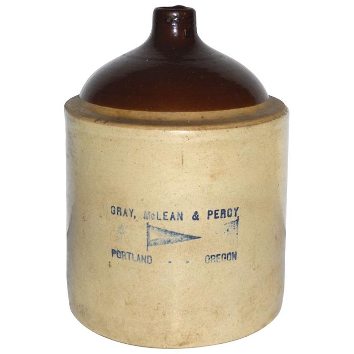 Stoneware, 1 gal fancy jug w/flag from Gray, McLean & Percy- Portland, OR, VG cond w/no damage, 10"H x 7.5"W.