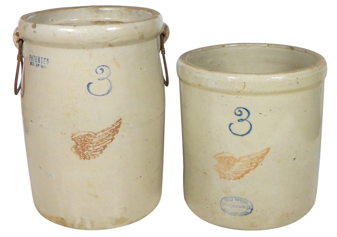 Stoneware (2), Red Wing 3 gal churn w/large wing, no oval & Patented Dec 21st, 1915 on side, no lid, small rim chip, o/wise Exc cond, 13.5"H & Red Wing 3 gal crock w/large wing & Union Stoneware oval, Exc cond, 11"H.