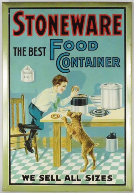 Stoneware Beveled Tin Over Cardboard String Hanging/Easel Back Sign. A few light scratches and rubs otherwise excellent condition. 13 X 19 inches.