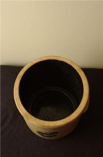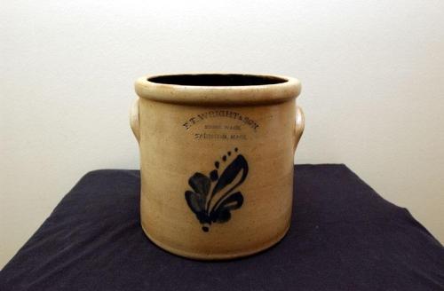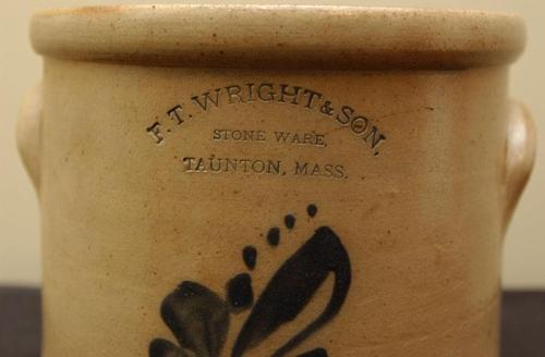 Cylindrical stoneware crock by F.T. Wright & Son, made in Taunton, Mass. Has side handles, impressed maker's mark and cobalt blue painted flower, prime condition, 7 1/2" by 25"
