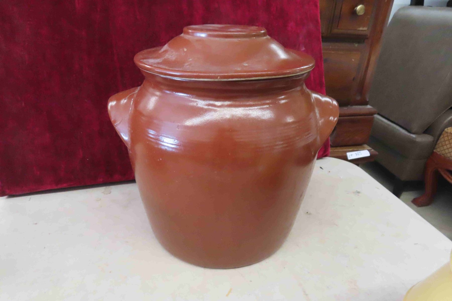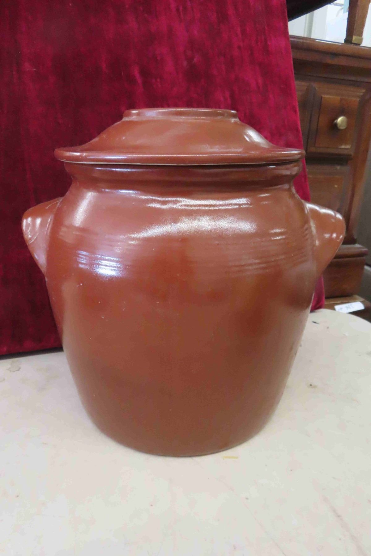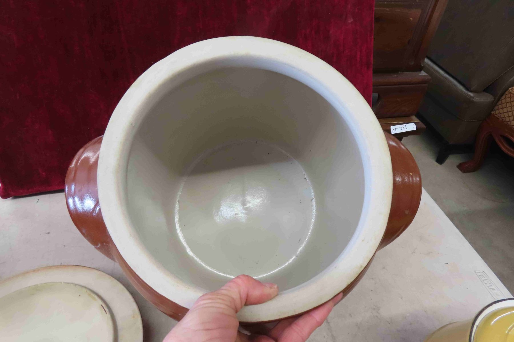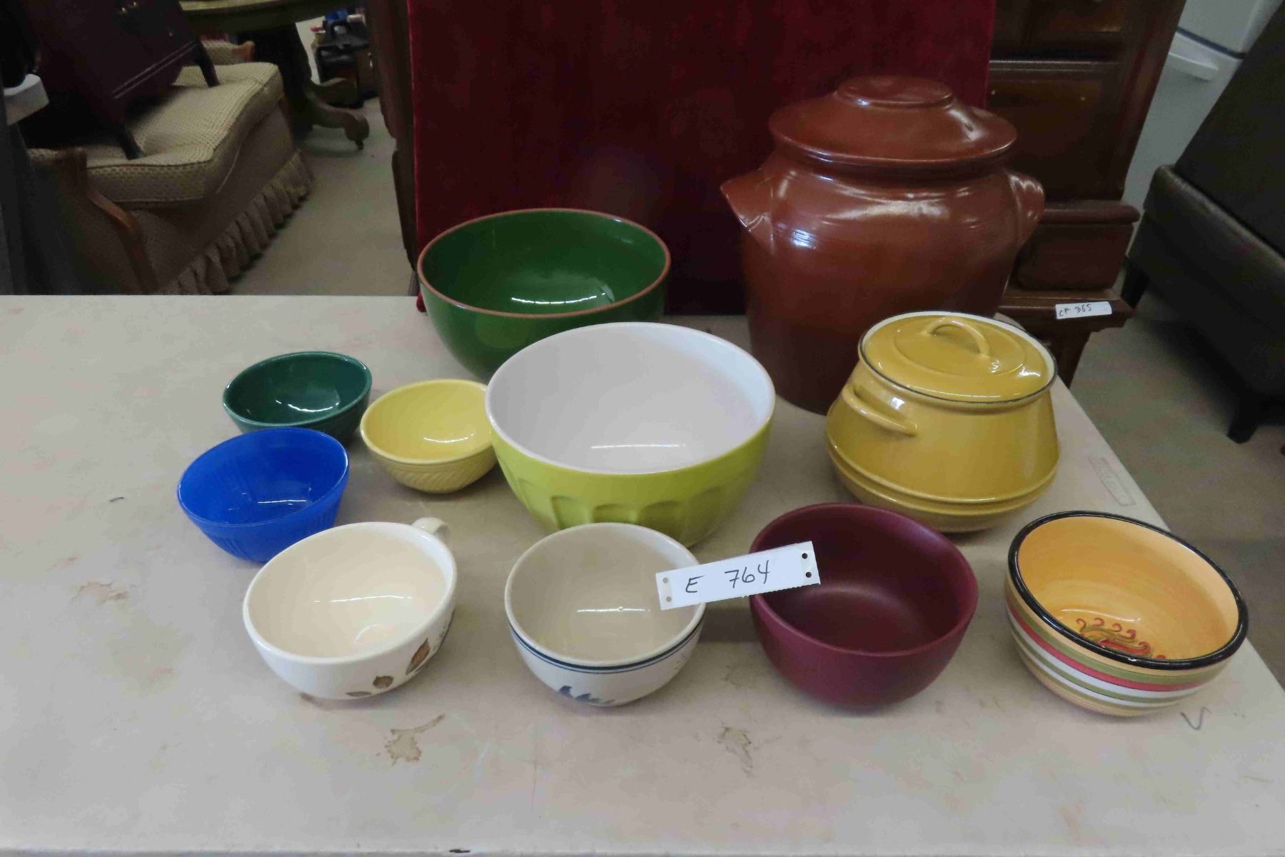 Stoneware Crock with Lid, Bowls, Metal Bean Pot