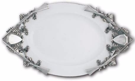 A detailed cast and hand-finished pewter figural hunting still life adorns each end, forming the handles of the lustrous oval stoneware tray.