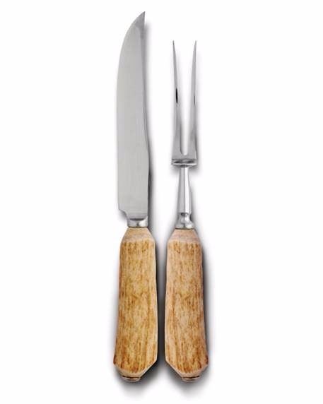 Designed for family meals and mid size roast meat or fowl, this carving set is defined by the exclusively designed hand-turned handles created from naturally shed elk antler and sparely ornamented with a rounded pewter end cap. The set consists of a curved, stainless steel bladed knife, allowing carving around the bones with ease.