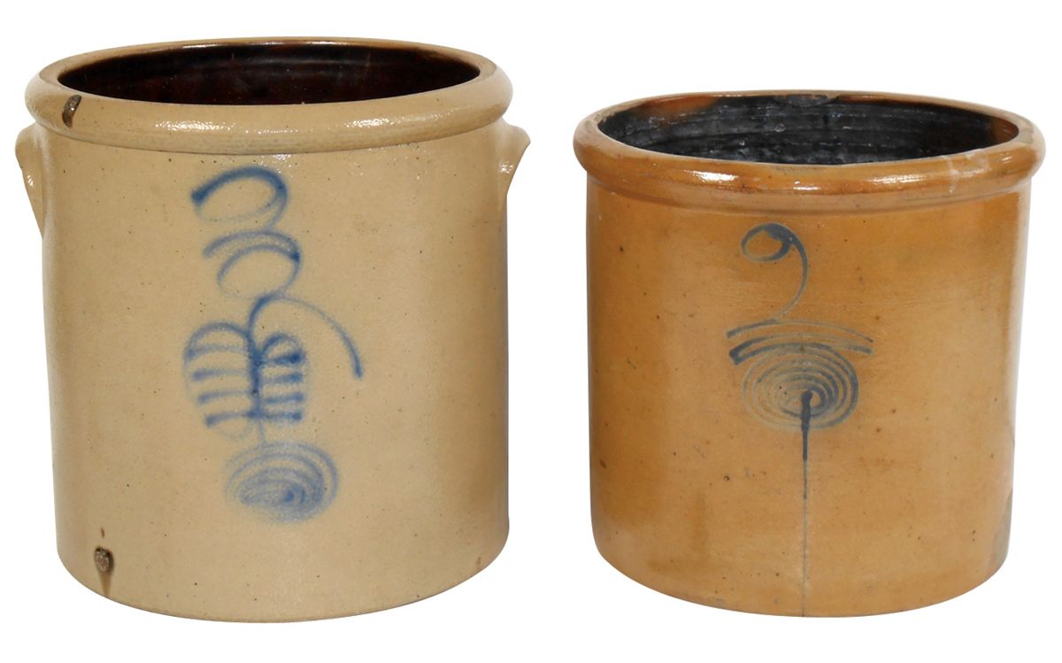 Stoneware Red Wing crocks (2), both salt glaze, 3 gal Rib Cage w/Target, turkey droppings, sm chip on inside rim & sm chip on bottom, o/wise Exc cond & 2 gal w/Target, bottom marked Minnesota Stoneware Co.-Red Wing, bail handles, few minor chips on inside rim & 4" hairline on back, 10" & 11"H.