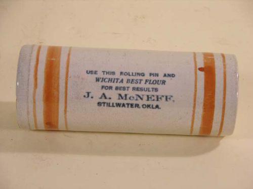 Stoneware rolling pin - Wichita Best Flour Stillwater, OK - J.A. Neff. Small chip on edge.