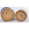 2 rounded bottom stoneware pots. Cream 4x5", marked The Pottery Co., 2.25" crack and 3 internal cracks. Blue 4x5.75"with lip ding. Gary Bracken Collection Gary Bracken Collection