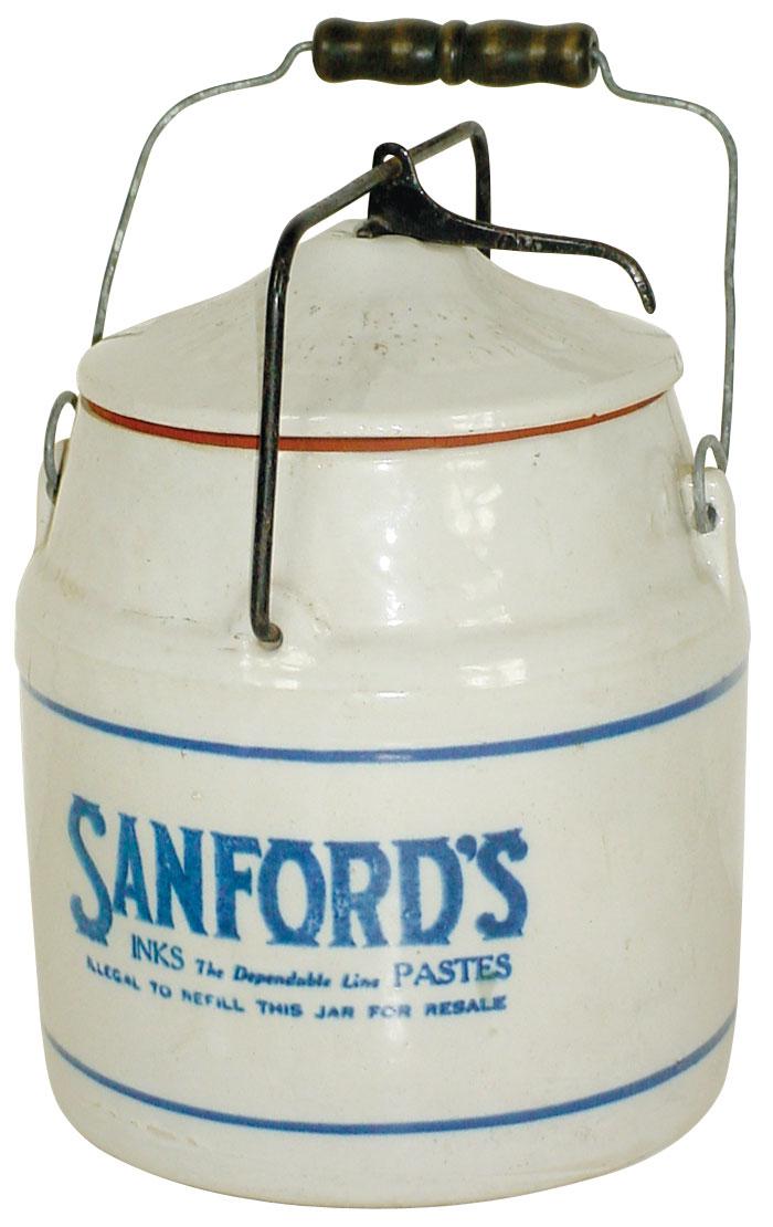 Stoneware Sanford's Library Paste gallon crock w/lid & complete paper label, cobalt blue advertising on other side, a great jar in Exc cond, 10.5"H.