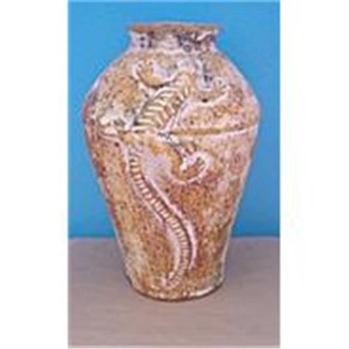 This is an intriguing urn imported from Mexico, with a lizard that is 14" long slithering up one side and a couple of frogs trying for the top on the other side. Fired in a soft tan color it does a great job of working with light and shadow. There is one chip on the top edge that appears to have originated at the factory. Looks like it was decorated and fired after the chip... Price has been adjusted to allow for this minor fault. Order three of anything that we can ship in one container, pay with PayPal and shipping is FREE !
