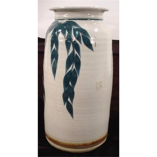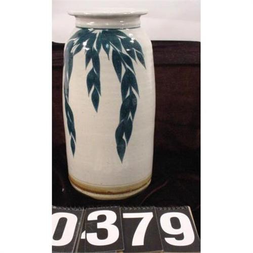 Stoneware vase with blue floral design 11-1/2" high age unknown and in very good condition and 5-1/2" dia aprox 4 Lb.[x]