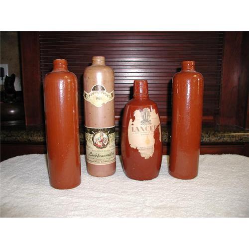 4 Stoneware Wine Bottles. Original Labels are still on two of the bottles. Great Shape. No Chips or Cracks. Great for Wine Collectors.