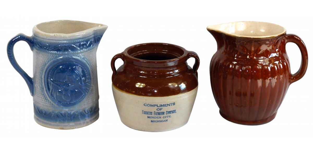 Stoneware advertising bean pot, Farmers Elevator Co.-Minden City, Mich., chip on handle & no lid, Blue & White Lovebird pitcher, Exc & brown ribbed pitcher w/flowered border, Exc w/one sm nick, 6" & 8"H.