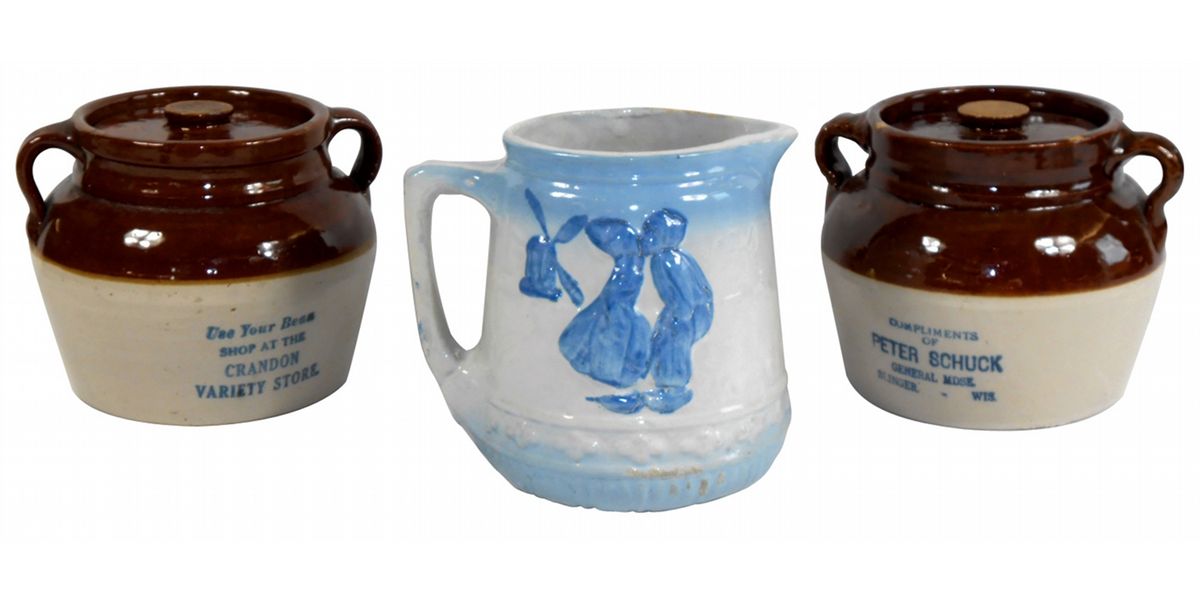Stoneware advertising bean pots & pitcher (3), Crandon Variety Store & Peter Schuck General Merchandise-Slinger, Wis., both Exc w/lids & Blue & White Dutch Children & Windmill pitcher w/a couple minor inside rim chips, 6" & 7"H.