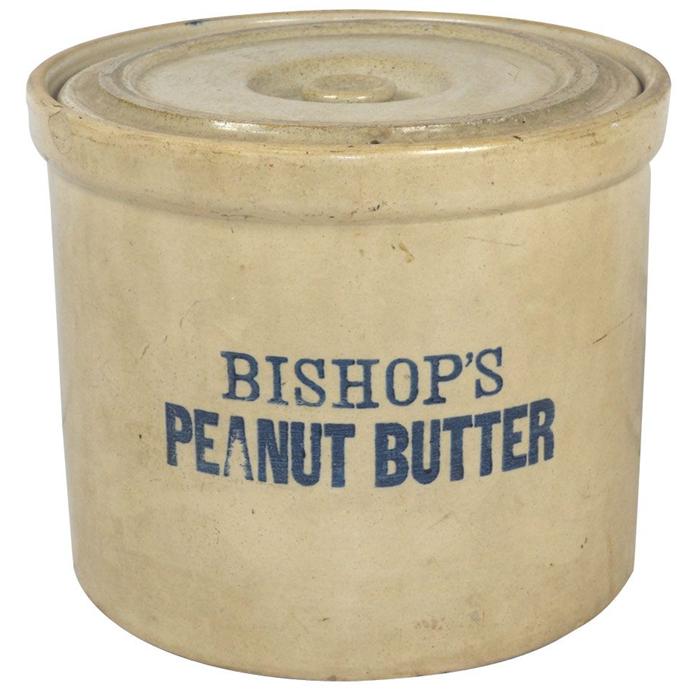 Stoneware advertising crock w/lid from Bishop's Peanut Butter, adv on both front & back, thumb-sized chip on rim, o/wise VG cond, 10.5"H x 13"Dia.