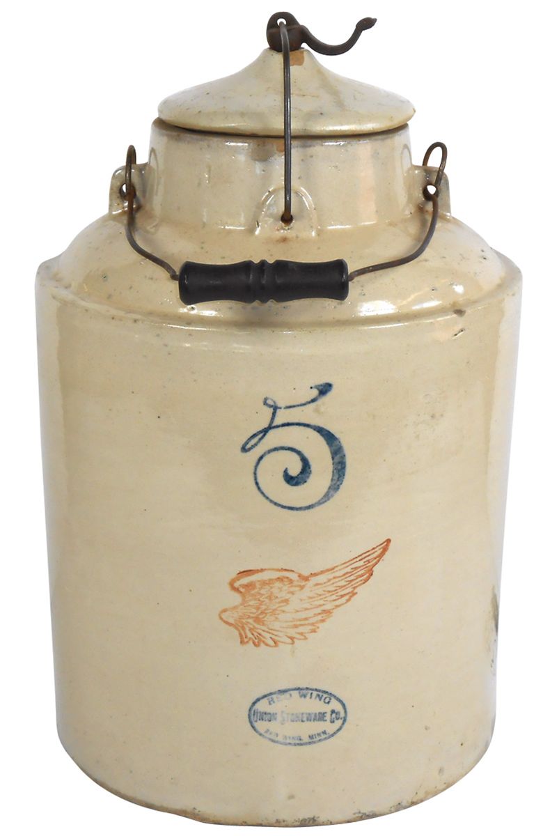 Stoneware ball lock jar, Red Wing 5 gal w/Wing, Good/VG cond w/a few chips on rim, shoulder & lid, 1