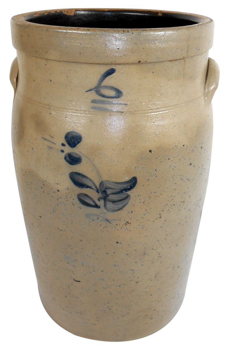 Stoneware churn, salt glaze w/floral design, 6 gal, 2.5" scratch on upper rim & a few minor chips on