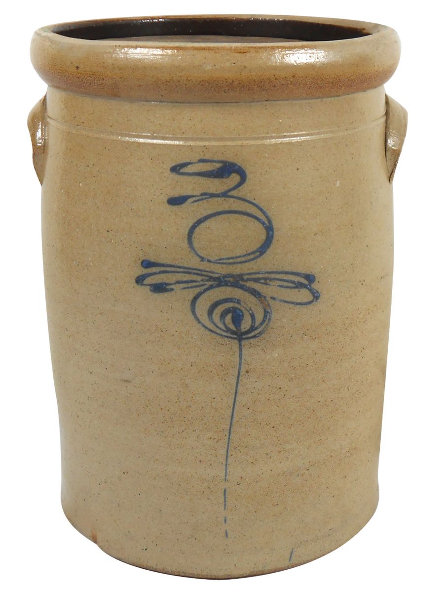 Stoneware churn w/lid, salt glaze 3 gal Lazy 8 w/Target, wood lid, Exc cond, 15"H.
