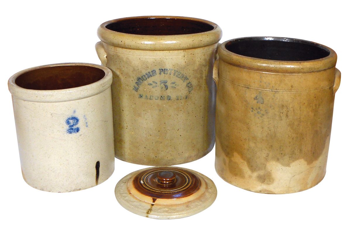 Stoneware crocks (3), 4 gal salt glaze w/tab handles, 5 gal Macomb Pottery salt glaze w/tab handles, 2 gal salt glaze & lid, lid has several chips on interior lip, 4 & 5 gal crocks have overall staining, o/wise all in VG cond, 10" to 13"H.