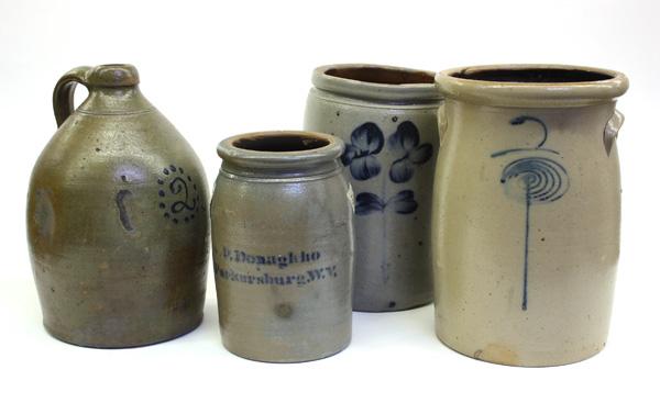 (lot of 4)Stoneware decorated crocks, consisting of a two gallon Red Wing decorated cobalt jug, a stencil decorated Parkersburg crock, a two gallon jug, and a floral decorated crock, tallest: 13''