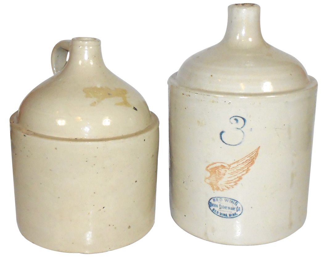 Stoneware jugs (2), Minnesota white funnel top jug w/M2 mark on bottom, VG cond w/some chips, 13"H & Red Wing 3 gal jug w/big wing & Union Stoneware oval, VG cond w/2 rim chips, 15"H.
