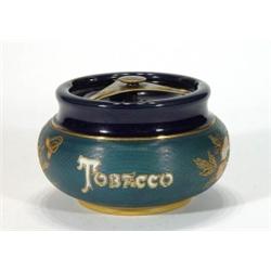 Stoneware tobacco jar with brass mounts hand painted and gilded with stylised flowers onto a blue ground, marks to base, 16cm diameter