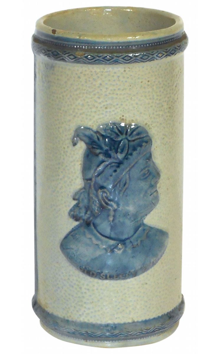 Stoneware vase, Old Sleepy Eye, Indian & cattails, Flemish blue & gray, VG+ cond w/small area of glaze missing from lip, 8.5"H.