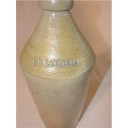 Stoneware whiskey bottle stamped "A.B. Robinson" and measures 9 1/2" tall and has two large chips to base.