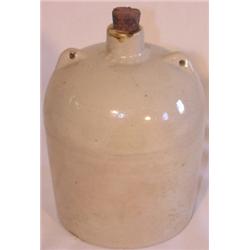 Stoneware whiskey jug marked "From the Casper Co.-Winston-Salem, NC-Lowest Price Whiskey House" on body. Jug is missing handle. Measures 9 1/2" tall.