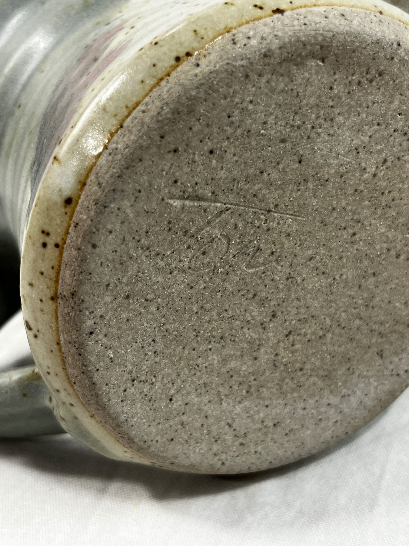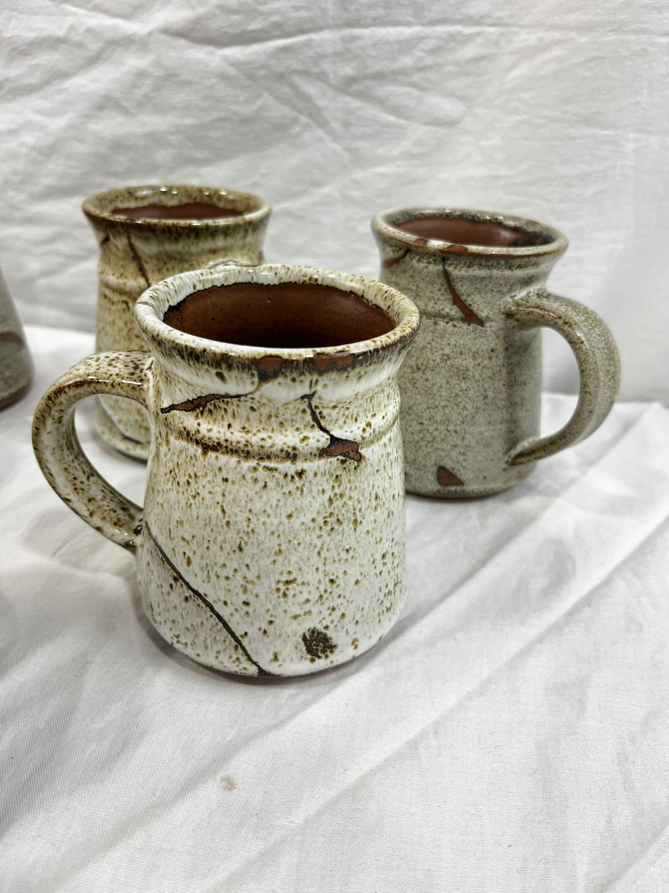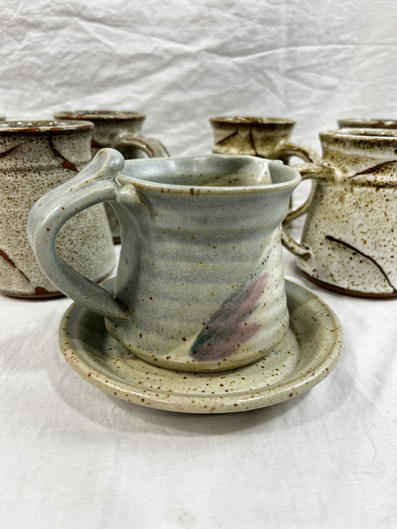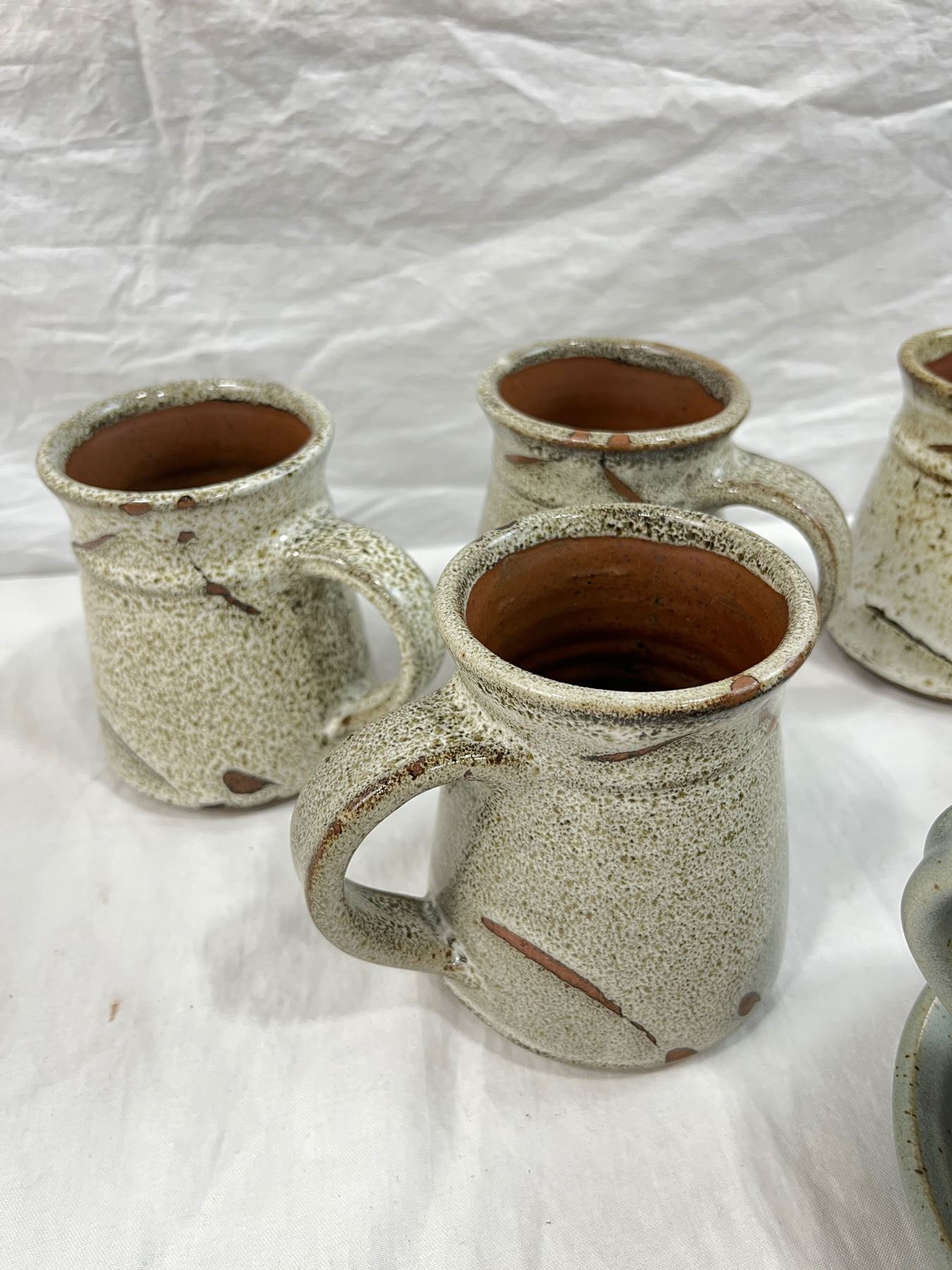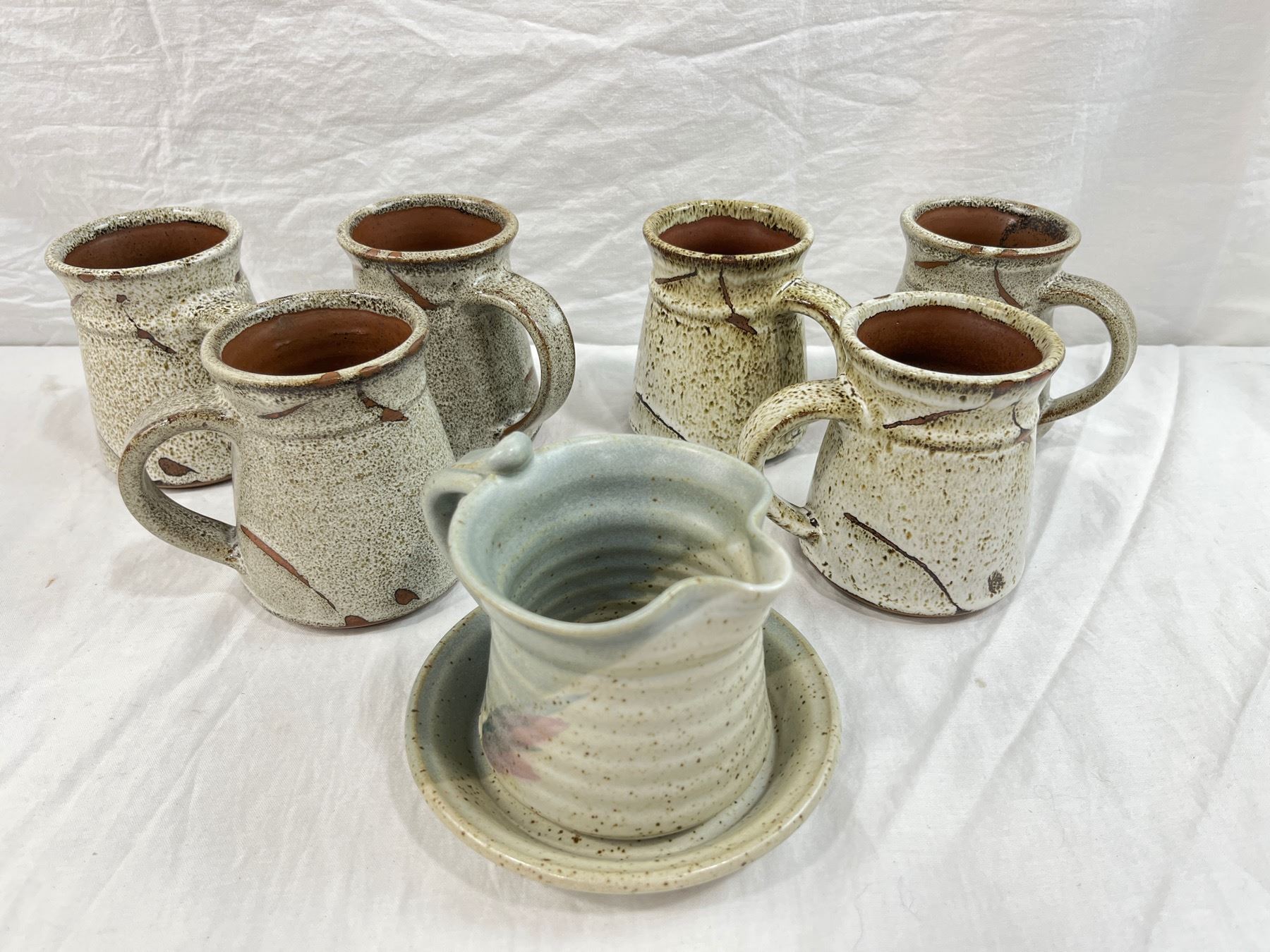 Stoneware mugs & creamer. Includes 6 mugs, 1 creamer with dish signed "Ton"