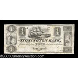 <TABLE cellSpacing=0 cellPadding=0 width="100%" bgColor=#000000 border=0><TBODY> <TR><TD width="100%"><TABLE cellSpacing=1 cellPadding=3 width="100%" border=0><TBODY><TR><TD width="100%" bgColor=#79735c><FONT face=arial color=#ffffff size=3><B>Description</B> </FONT></TD></TR><TR><TD width="100%" bgColor=#ffffff><FONT face=arial size=2><B>Stonington, CT- The Stonington Bank</B></I> $4 G30<BR>A popular Connecticut $4 note with an attractive sailing ship vignette. <B>About Uncirculated,</B></I> with a light water stain barely worthy of mention. (175-275 ) </FONT></TD></TR></TBODY></TABLE></TD></TR></TBODY></TABLE><BR><TABLE cellSpacing=0 cellPadding=0 width="100%" bgColor=#000000 border=0><TBODY><TR> Important notice: Heritage usually auctions material at the rate of 200-250 lots per hour. On some occasions eBay Live bid software or the Internet may not be able to keep up with the pace of the auction. We recommend placing a realistic absentee bid now as insurance to avoid disappointment. Occasionally the auctioneer may eliminate or reject an eBay Live bid, and the auctioneer may also reopen a lot after the close of the eBay live bidding (usually because we missed an audience bid), and may reject your bid even if it shows you as the winning bidder. By bidding via eBay Live, you agree that Heritage may award the lot to another bidder at its sole discretion under the circumstances described above or any other reasonable circumstances. Also please note that all Heritage lots purchased through eBay Live carry a 20% Buyer's Premium. Please make sure you read the Terms and Conditions before you bid.</TR></TBODY></TABLE>