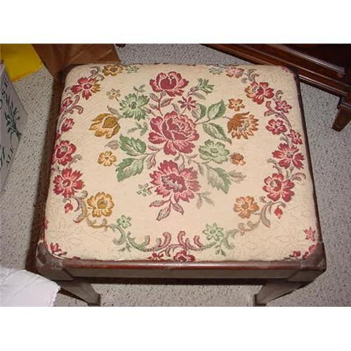 The stool is taller than a regular foot stool. The seat is not attached but is recessed into the top of the stool. Even though the fabric on the stool is in good condition it can be easily replaced with a design of your choice. The legs are inset into the frame of the stool - so no wobbling there! It is sturdy and well made.