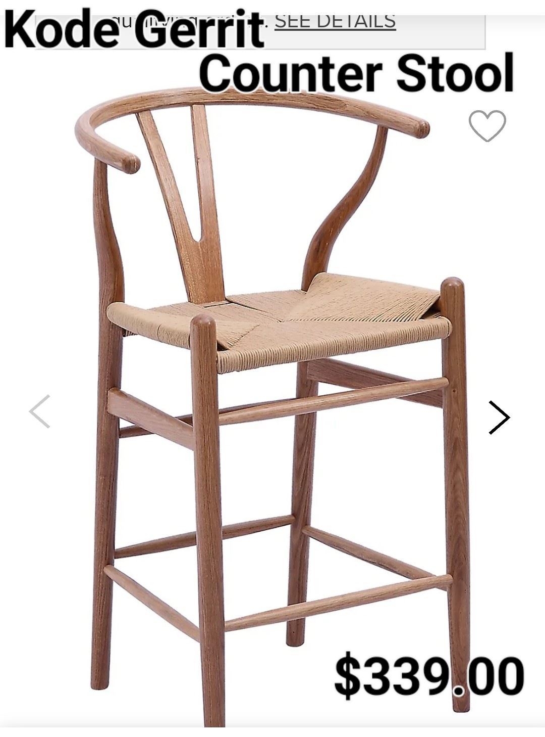 Kode Garrett counter stool,Solid wood frame with woven seat design, elegant curvature backrest, ideal for kitchen islands, new.
