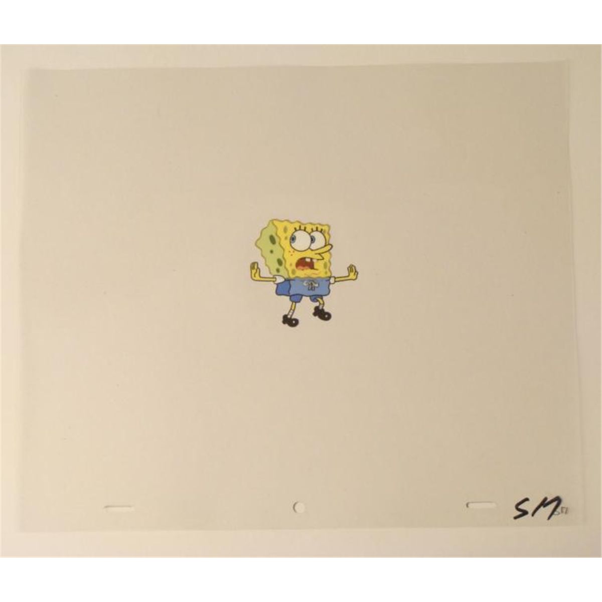 This original animation cel is from the Nickelodeon TV show SpongeBob Squarepants. The story takes place under the deep blue sea in Bikini Bottom, where SpongeBob resides. SpongeBob, who is a yellow, porous sponge, is your typical happy-go-lucky character, as he is always cheerful and enjoys making people laugh. Patrick Star, SpongeBob's neighbor who is a starfish, is your average children's show idiot, as he boasts knowing nothing and is often getting himself into ridiculous situations. Between the homes of these two lies the home of the miserable Squidward, a squid, who is known for being grouchy and playing tricks on SpongeBob and Patrick. Both SpongeBob and Squidward work at the Krusty Krab, a fast food business run by the greedy money-loving Mr. Krabs, a crab, the arch rival of the evil, possibly misunderstood, Plankton. Another neighbor, Sandy Cheeks, an athletic squirrel who normally wears an astronaut's space suit, was introduced in "Tea at the Treedome." She spends most of her time inventing and experimenting. * "STOP!" * Original Production Animated Cel Overall Size of Cel: 10 1/2" x 12 1/2" Very Good ConditionThis is an original hand-painted cel set-up used in the production of an episode of "SpongeBob SquarePants." Each one-of-a-kind set-up represents a slight change in position of the characters. When individually photographed and projected in rapid succession, the images appear to move. * To create production cels, the original animator's drawing is transferred onto an acetate cel (by hand-inking and/or photo copying). The cel is then hand-painted on the reverse side. * The cel received by the winning bidder may be ever so slightly different from the one in the auction photos. * The cel is ready to be matted and framed. The animator's notations are at the bottom of the cel. There is some slight paint fade to SpongeBob's outline. * *