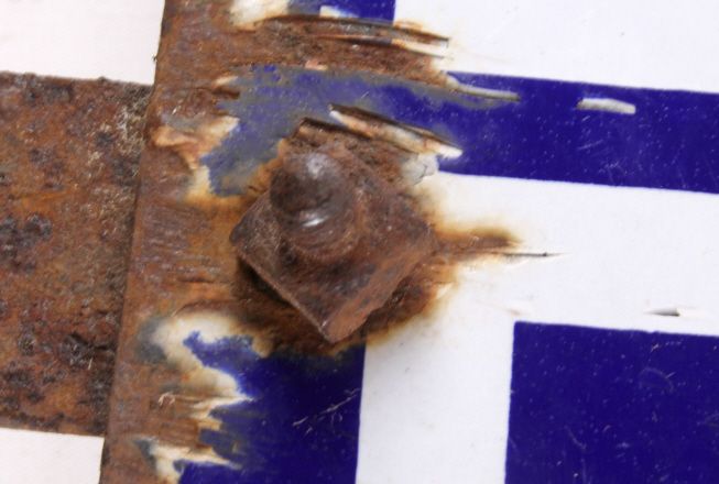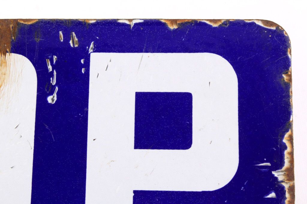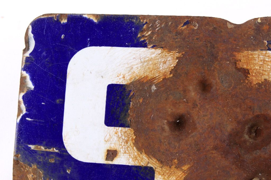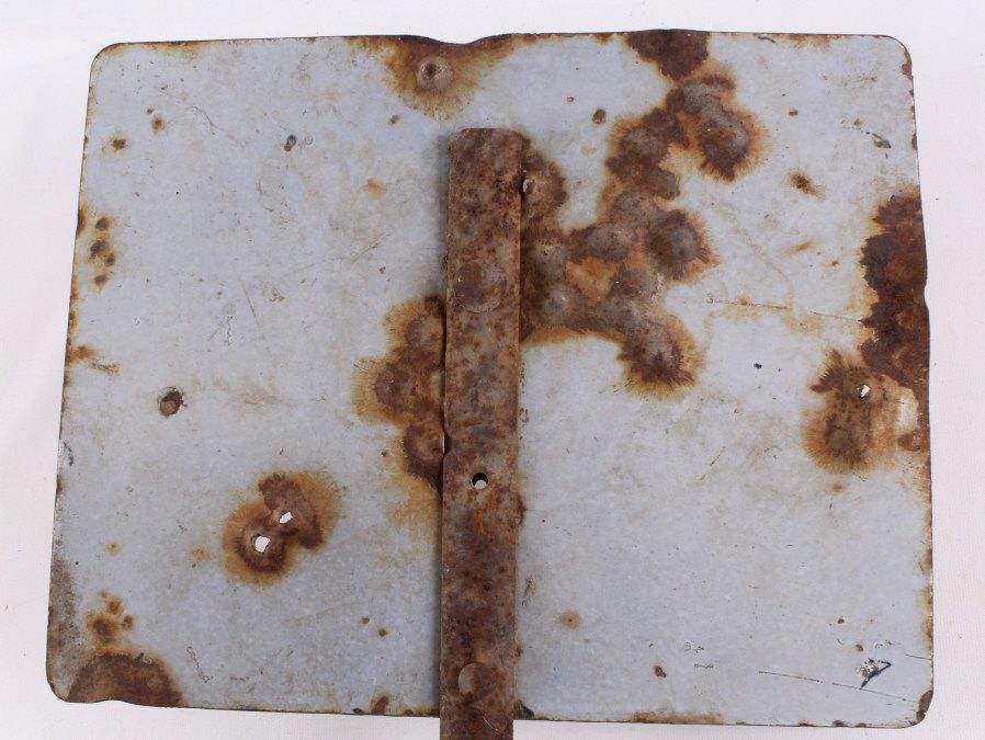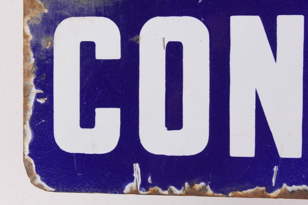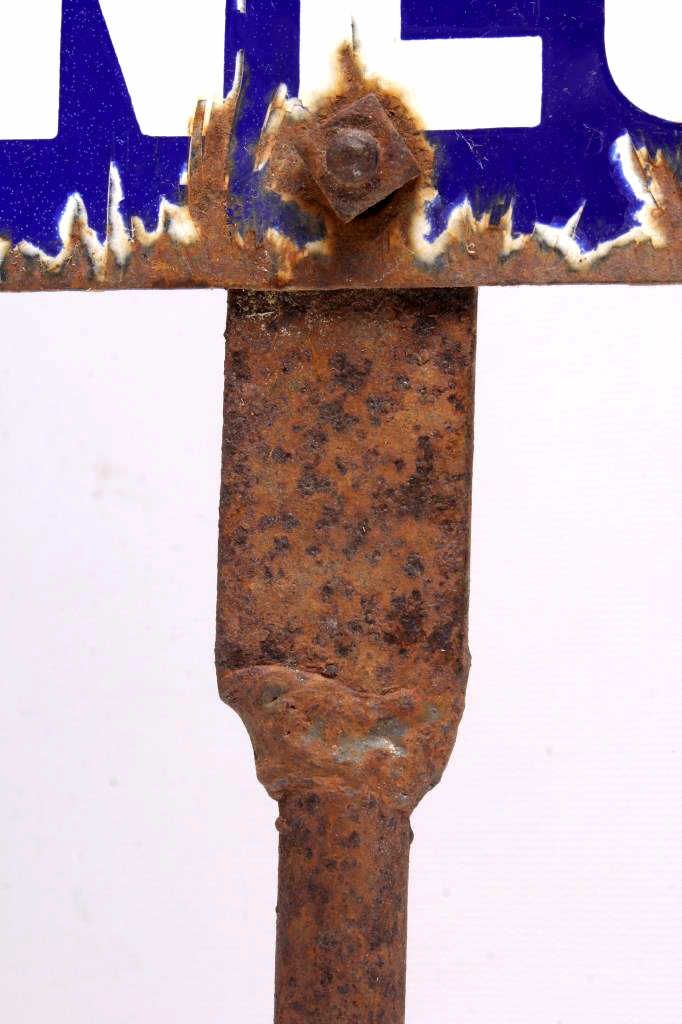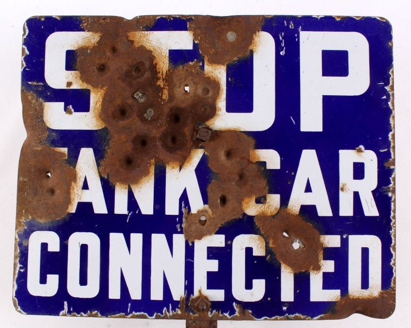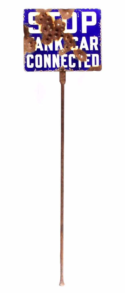 This is an original Railroad Sign that reads, "Stop Tank Car Connected". The enamel sign is from the 1930's in Montana and shows chipping and bullet holes, but overall a great Railroad collectible. Sign is mounted to the original metal pole that would have been mounted to the switch. Sign 12"x15" and overall height is 53"
