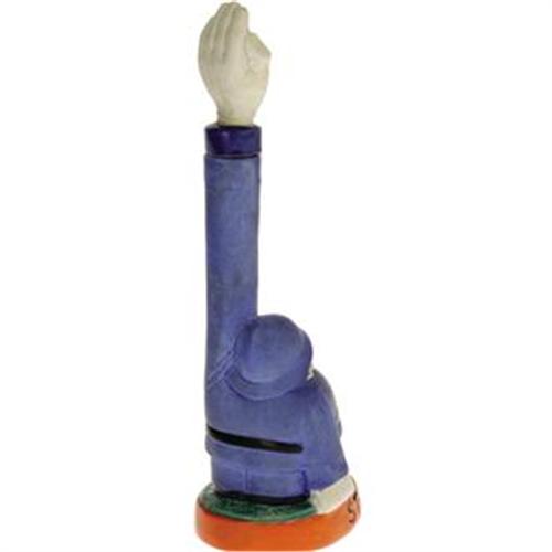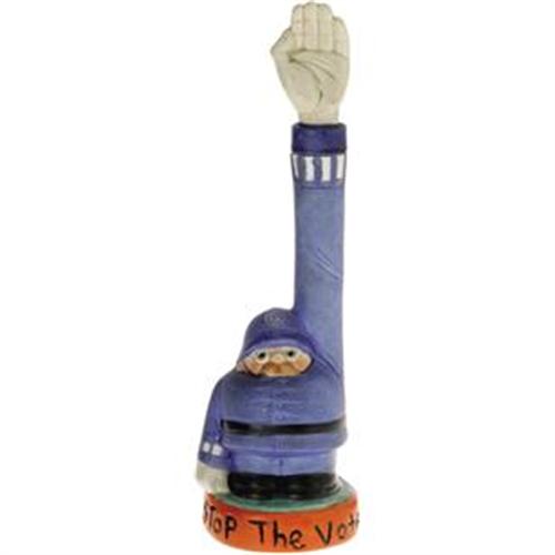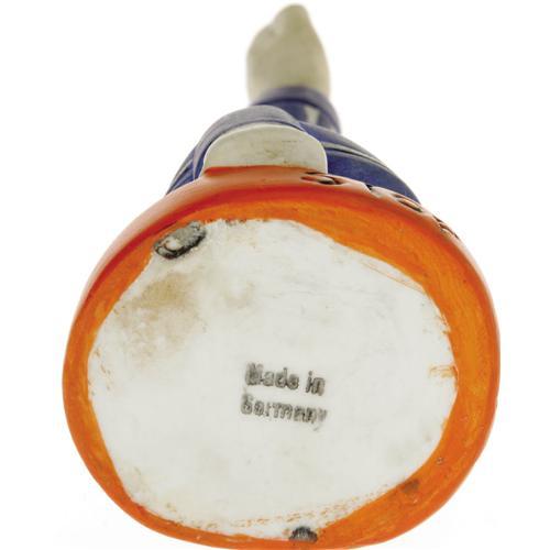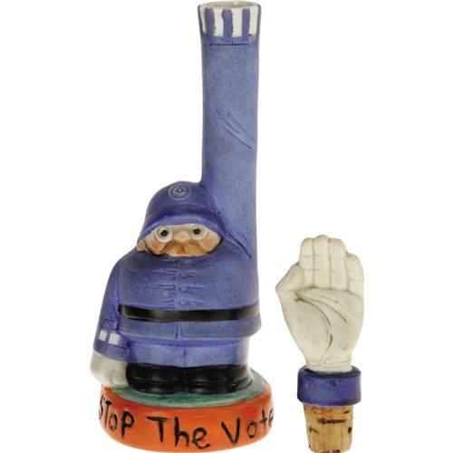 <B>Stop the Vote Anti-Suffrage Policeman Figure.</B></I> Produced as an anti-woman's Suffrage item, this cartoonish bisque policeman is a figural bottle. With great big-eyed expression and opened hand as the stopper, he encourages others to "Stop the Vote". Made in Germany, this type of anti-Suffrage figure has become heavily sought after by Suffrage collectors today. The more common police figure is a stiff tall 6" policeman which regularly finds its level at $1500. This version is definitely harder to find as the "hand" stopper would often be missing or broken. Offered here is an absolutely beautiful example with all the original paint intact. Height 7.25".