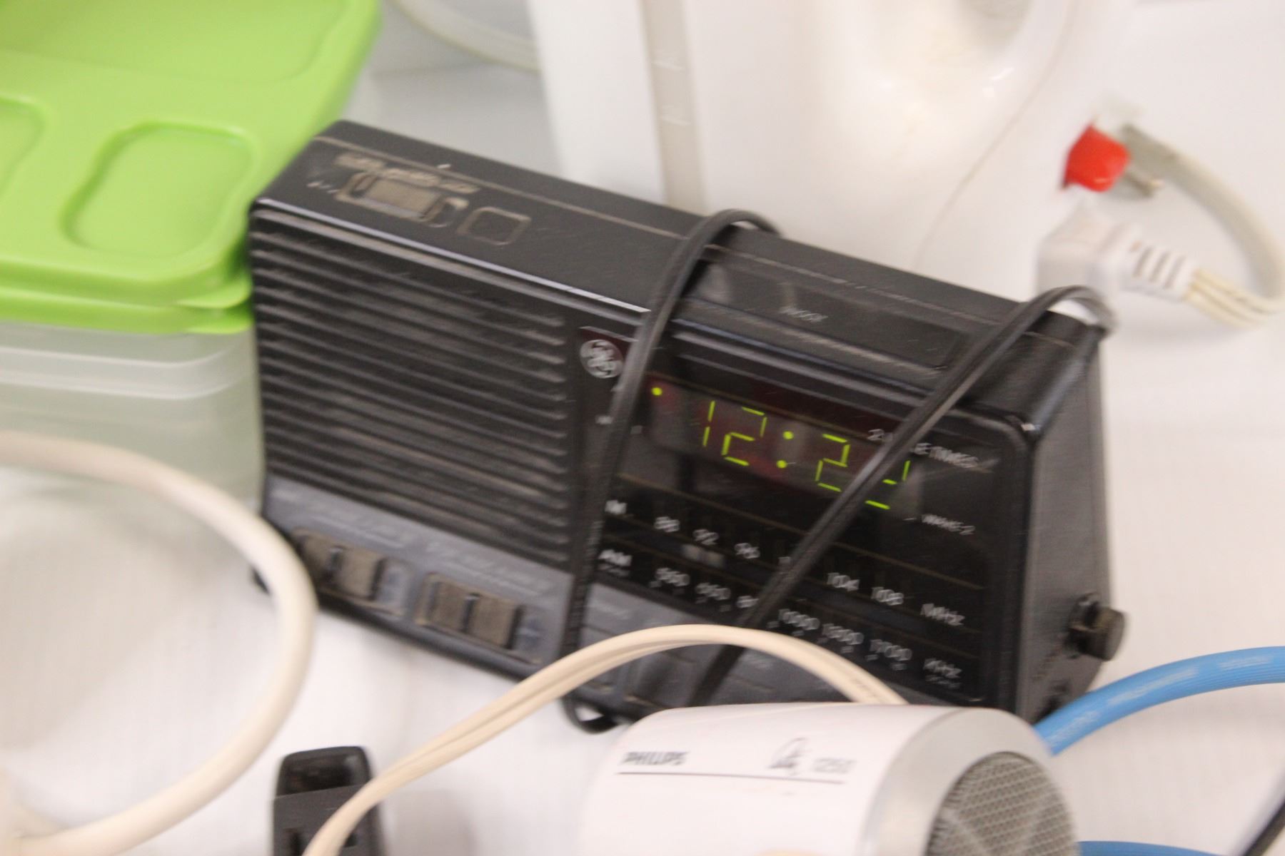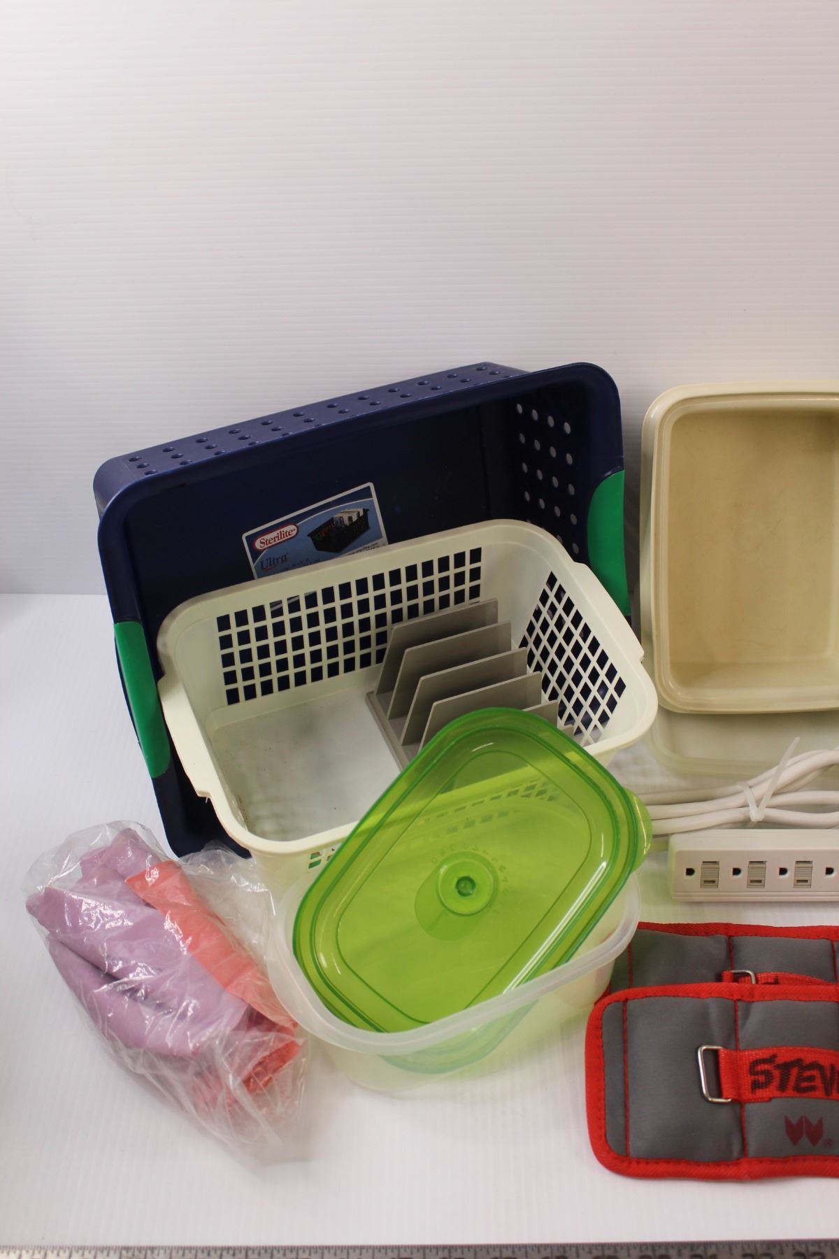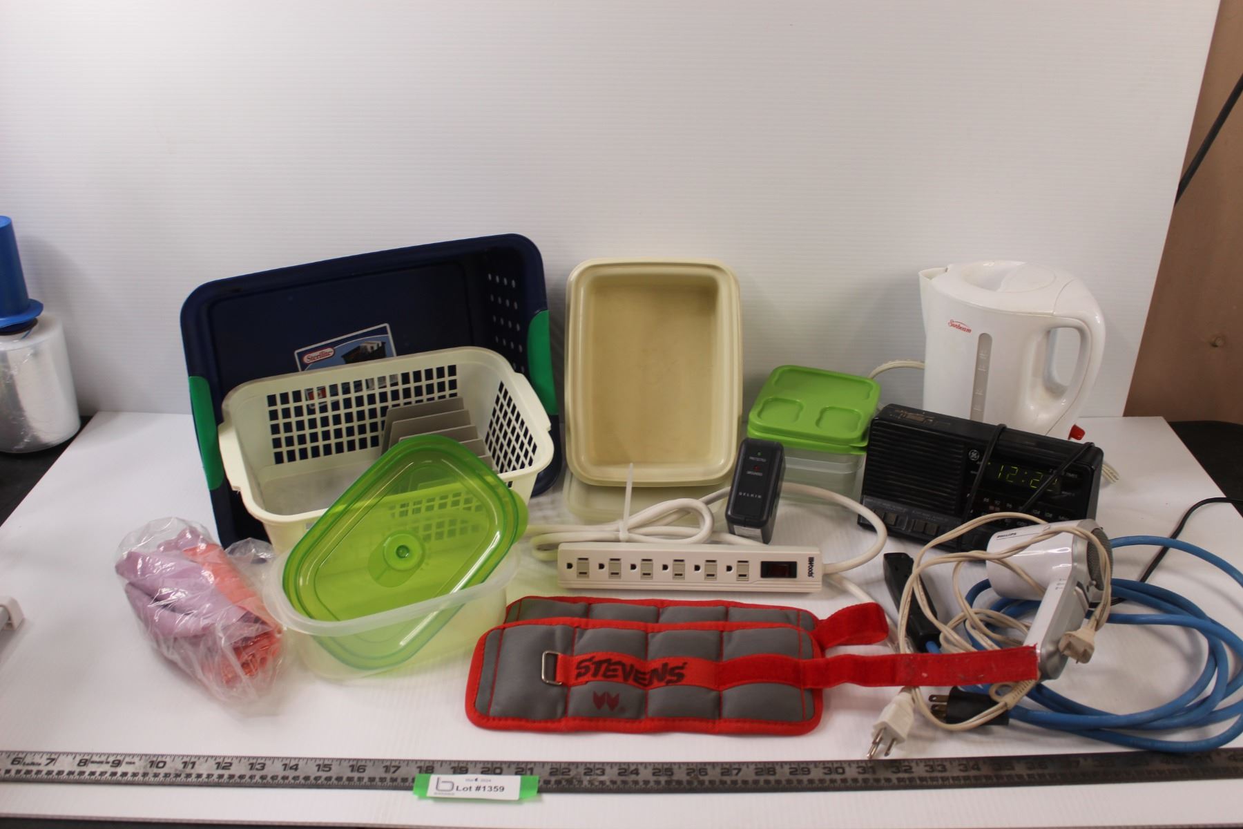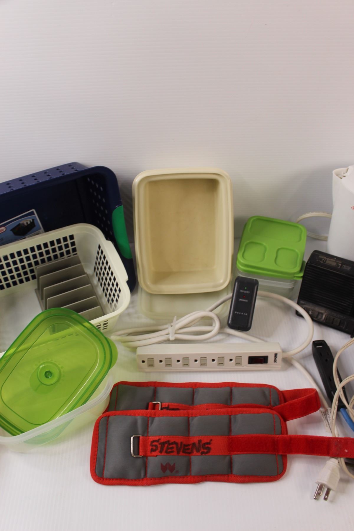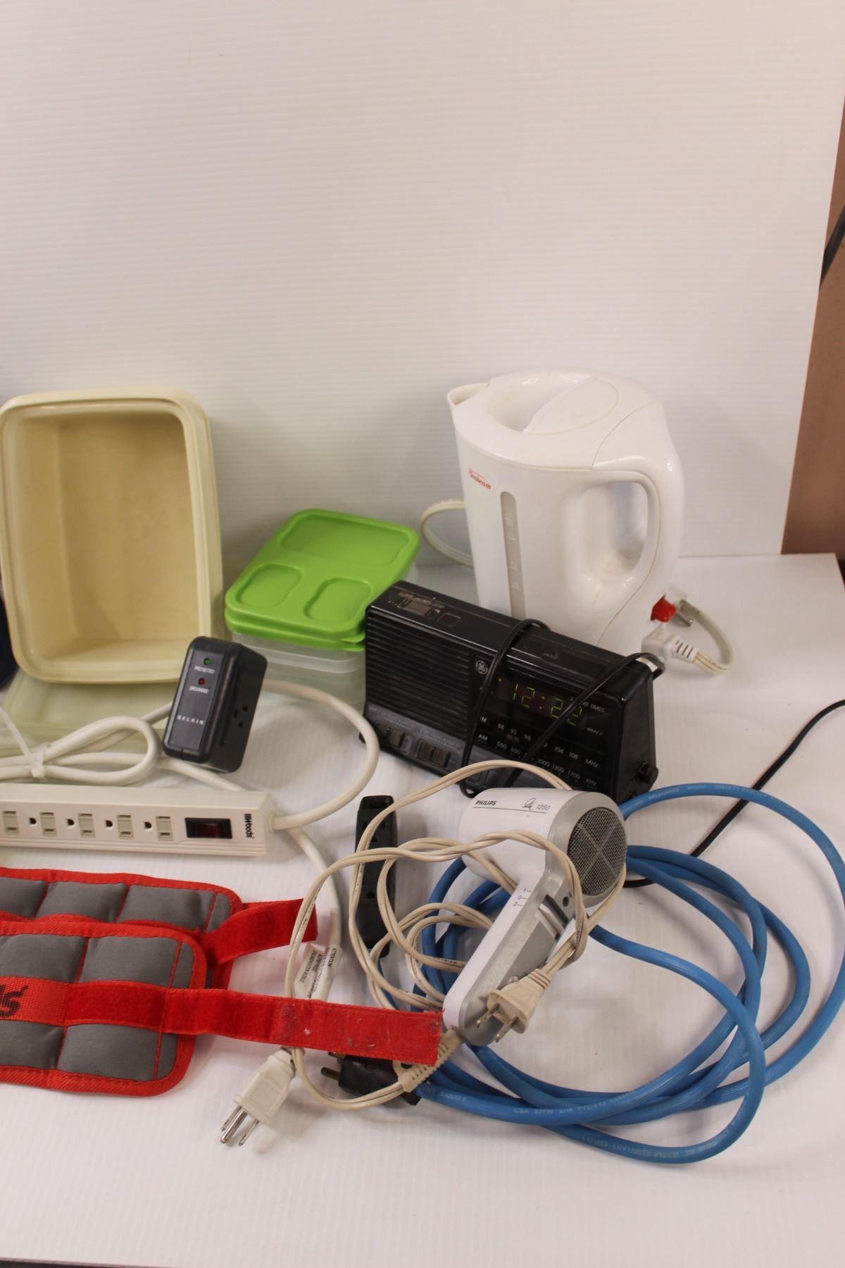 Storage Baskets & Containers(Tupperware/Rubbermaid), Alarm Clock (working), Extension Cord (6'), Power Bar, Belkin GFI Plug, Sunbeam Electric Kettle (working), Philips 1250 travel Blow Dryer (working), Ankle Weights & misc.