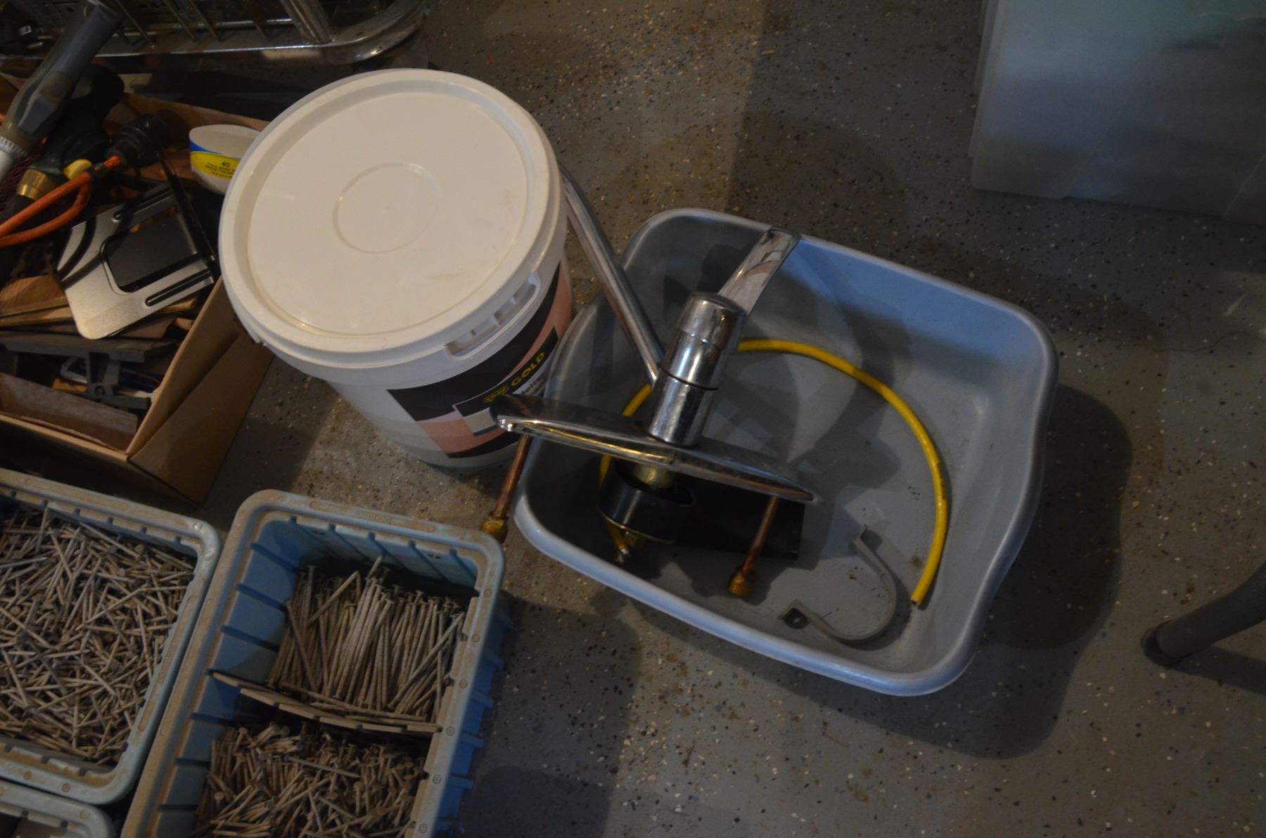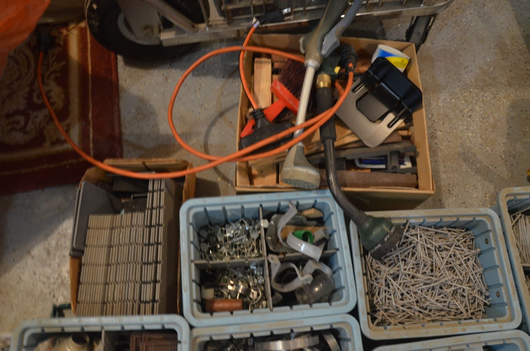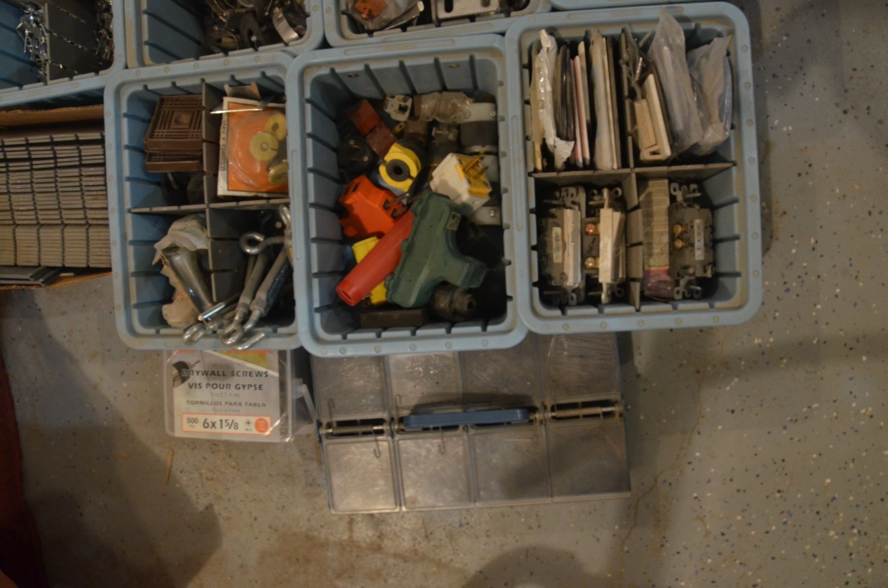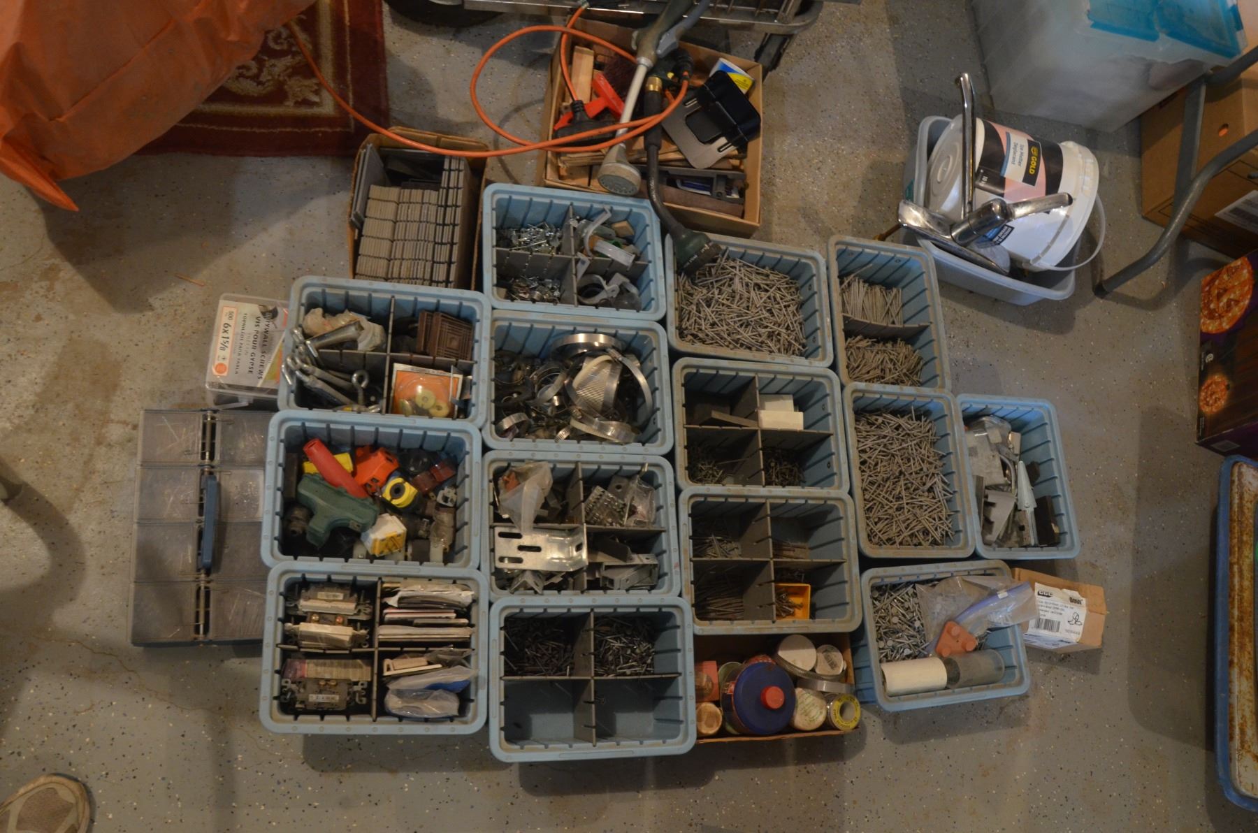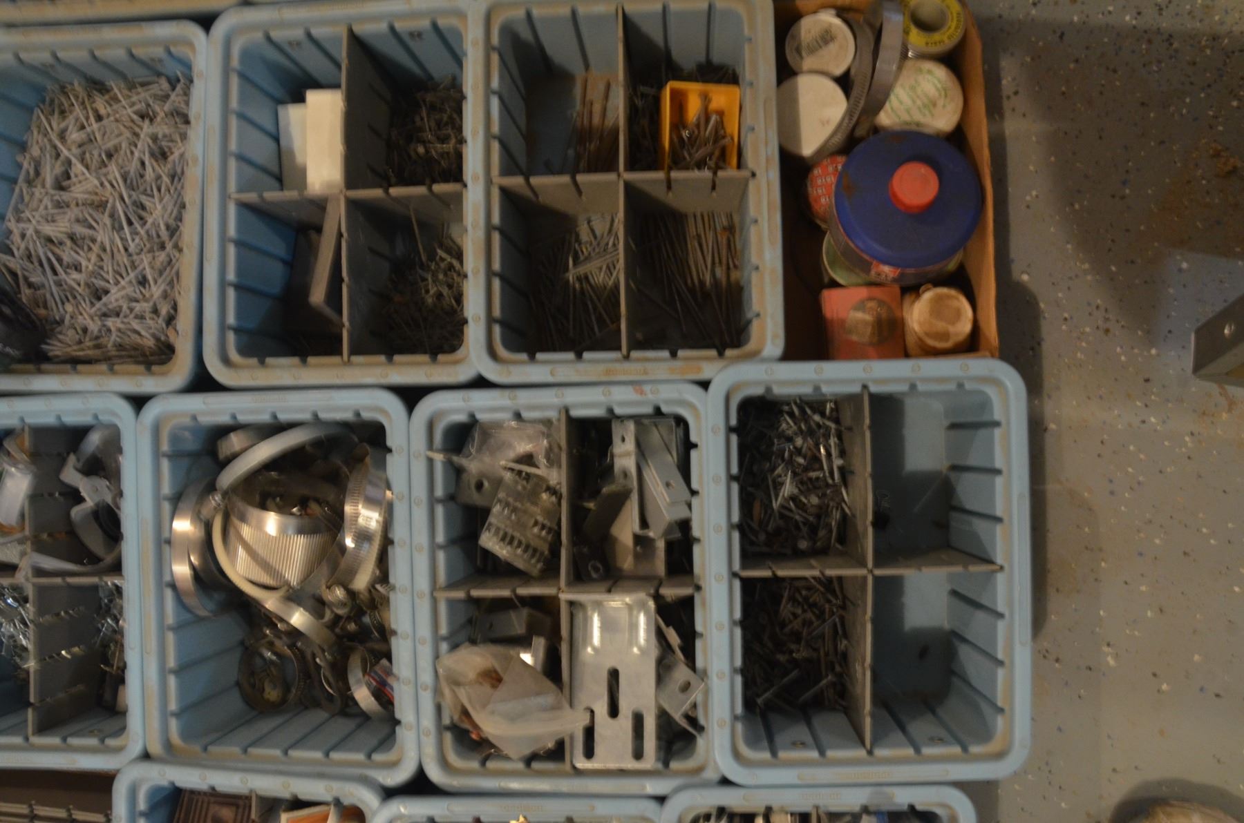 Storage Bins w/ Contents- Nails, hose Clamps, etc