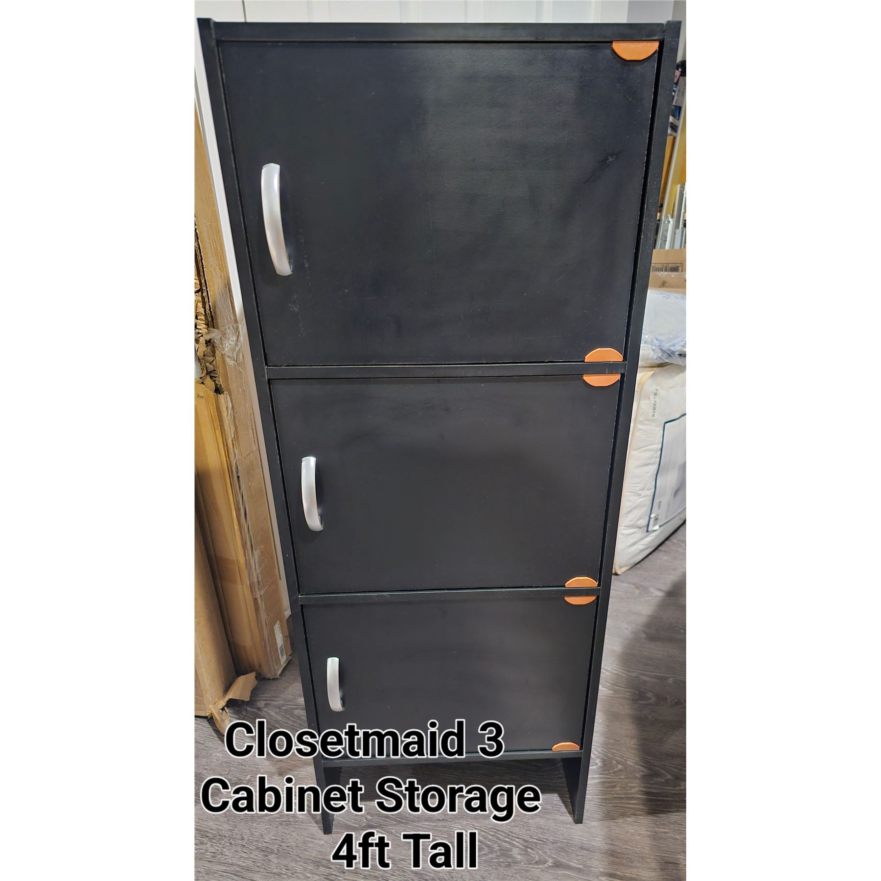 Three-tier black storage cabinet, 4ft tall, ideal for office or home organization, new.