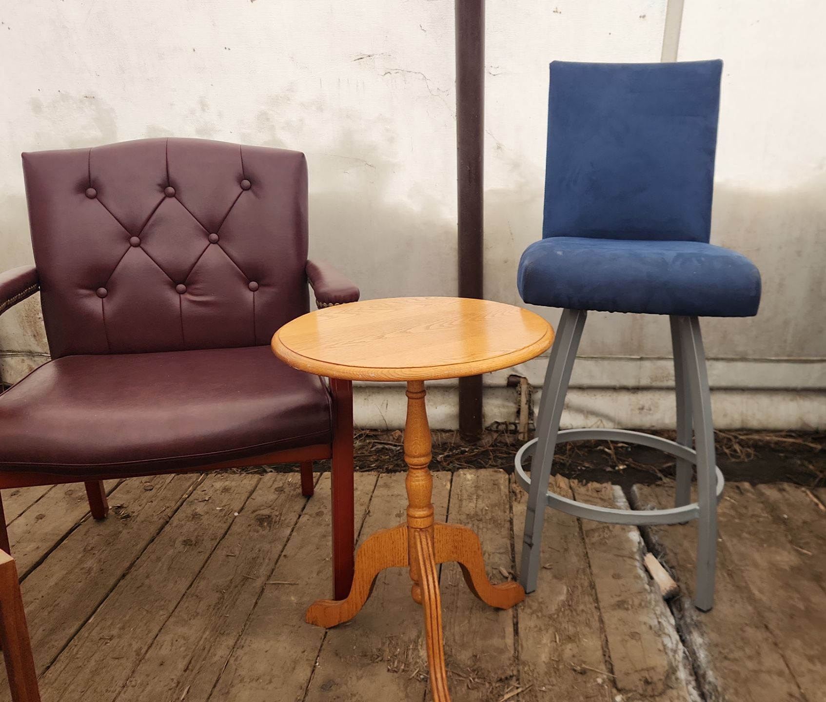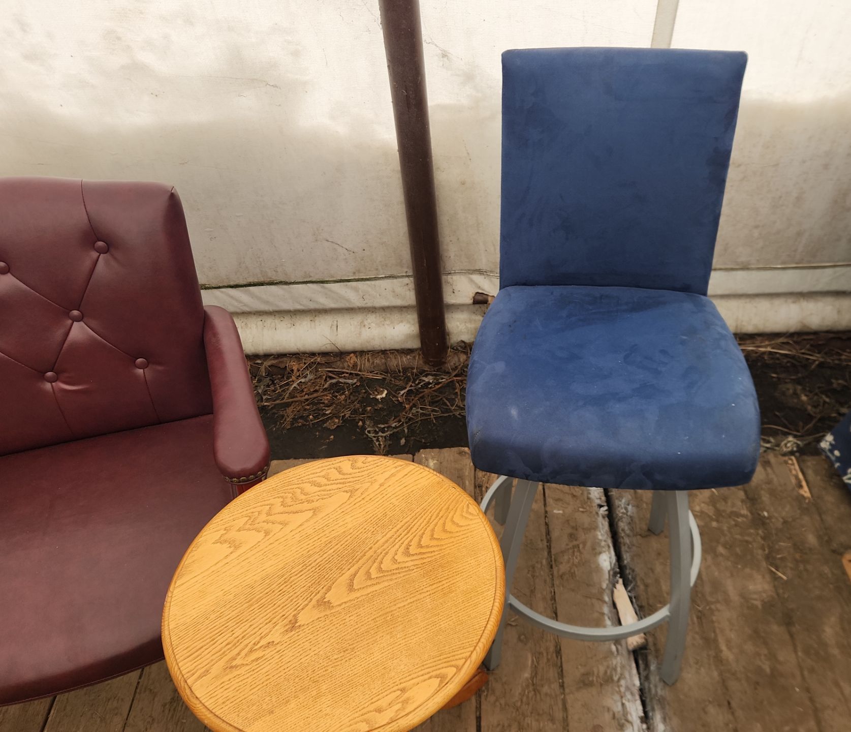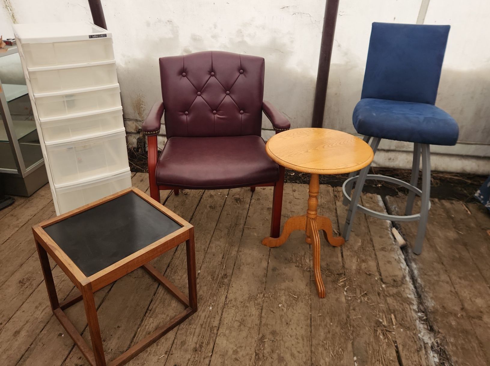 This versatile lot includes assorted chairs, tables, and a storage shelf, perfect for furnishing a home, office, or studio. Each piece offers functional seating or storage solutions, combining practicality with style.