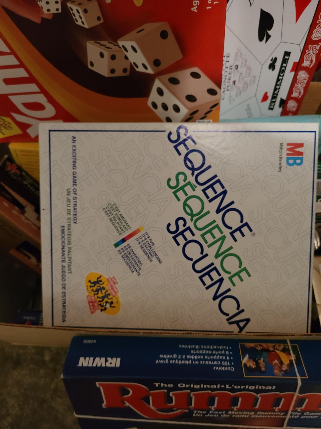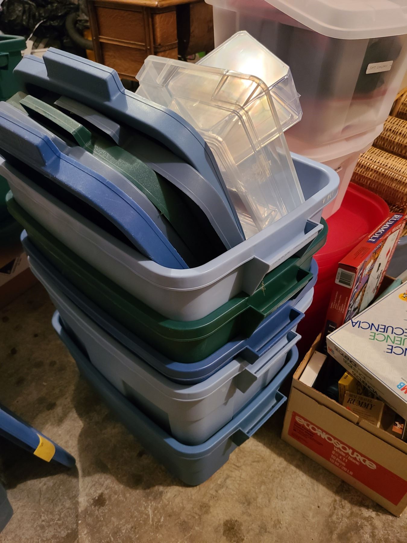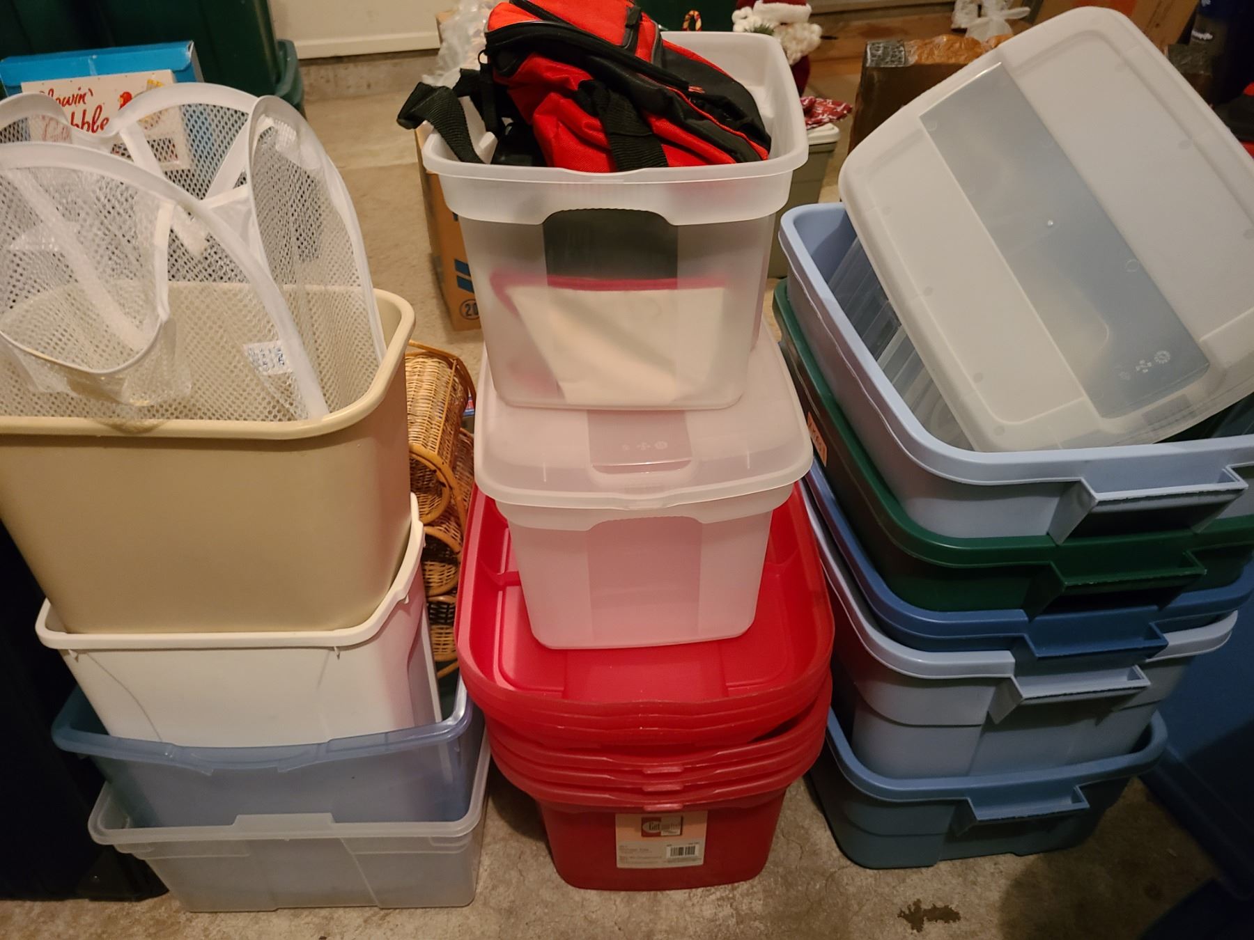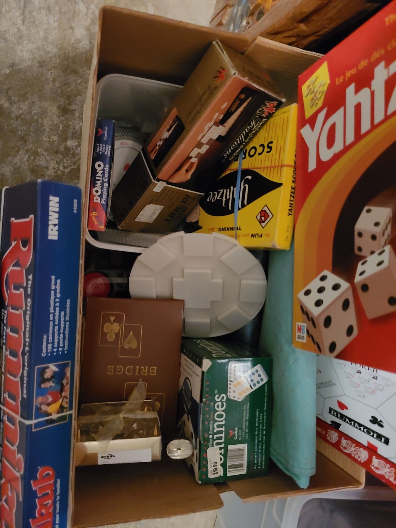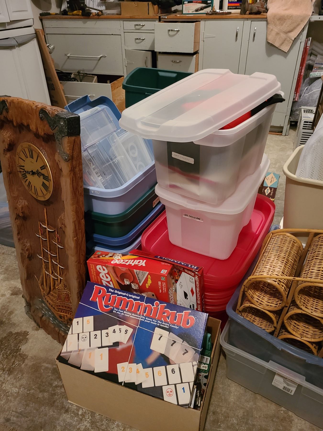 Lot includes storage containers, games, and more. Pickup 9 am.
