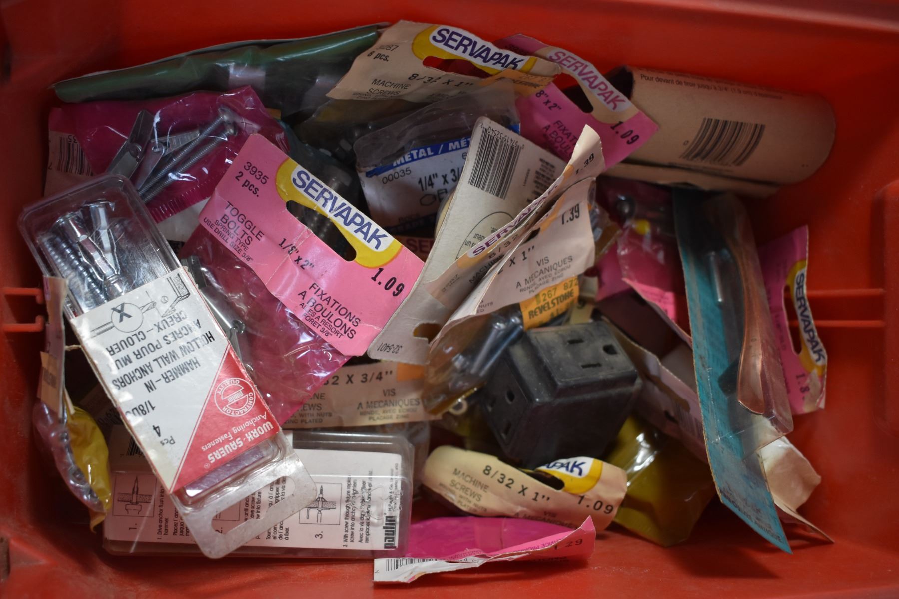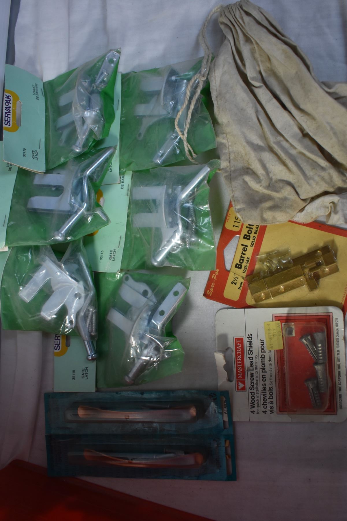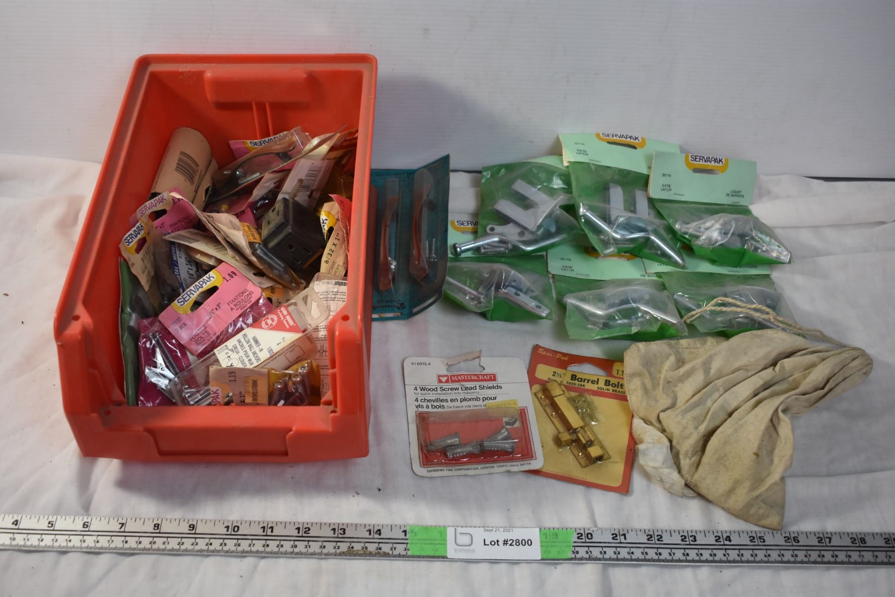 Storage container with misc household repair - gate latches, screws, cabinet handles