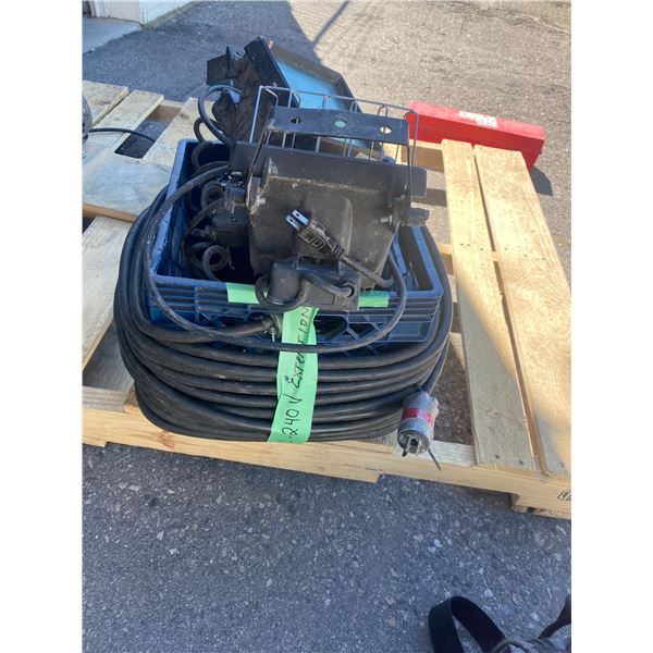 Two work lights, extension cord and crate