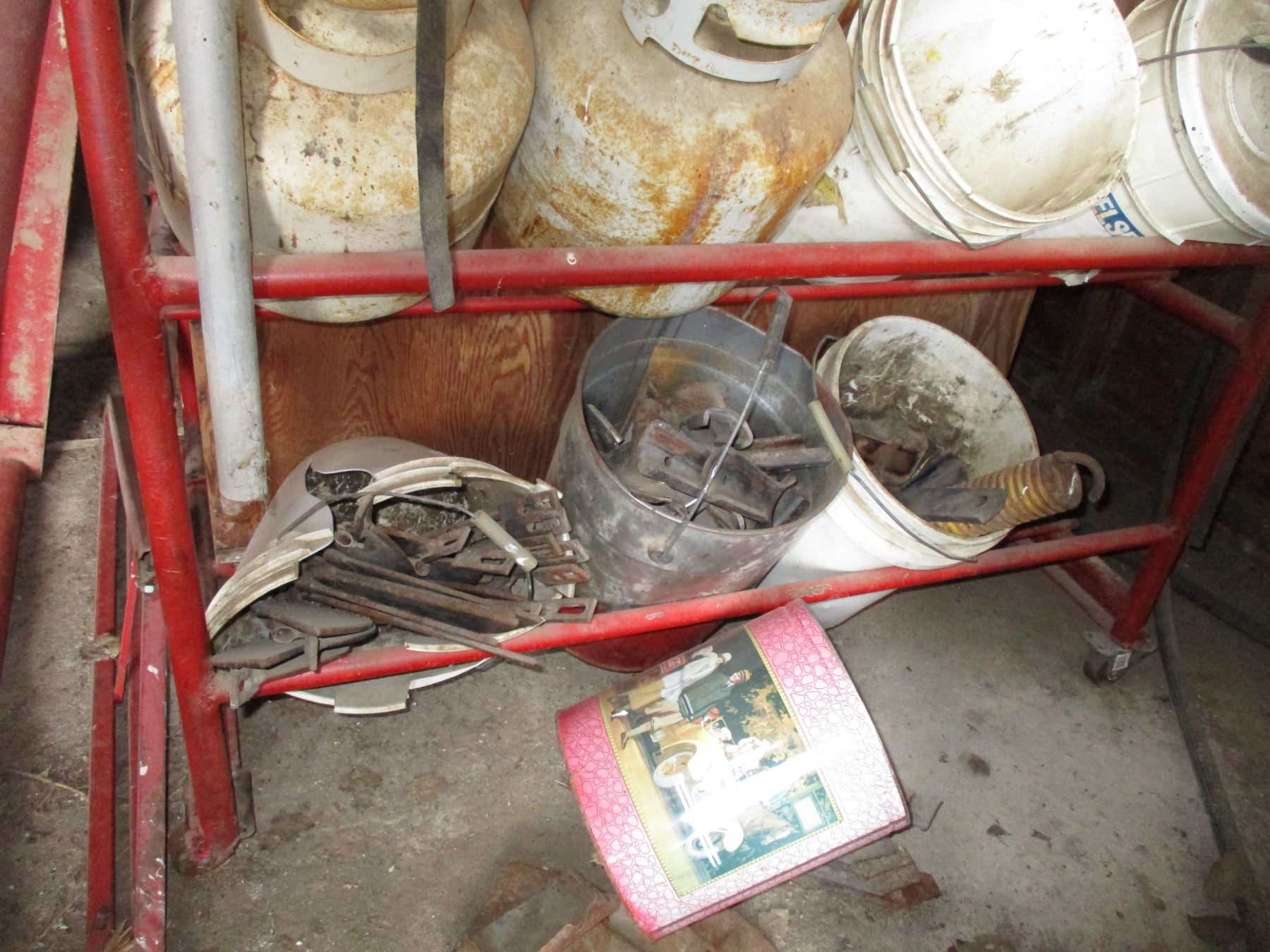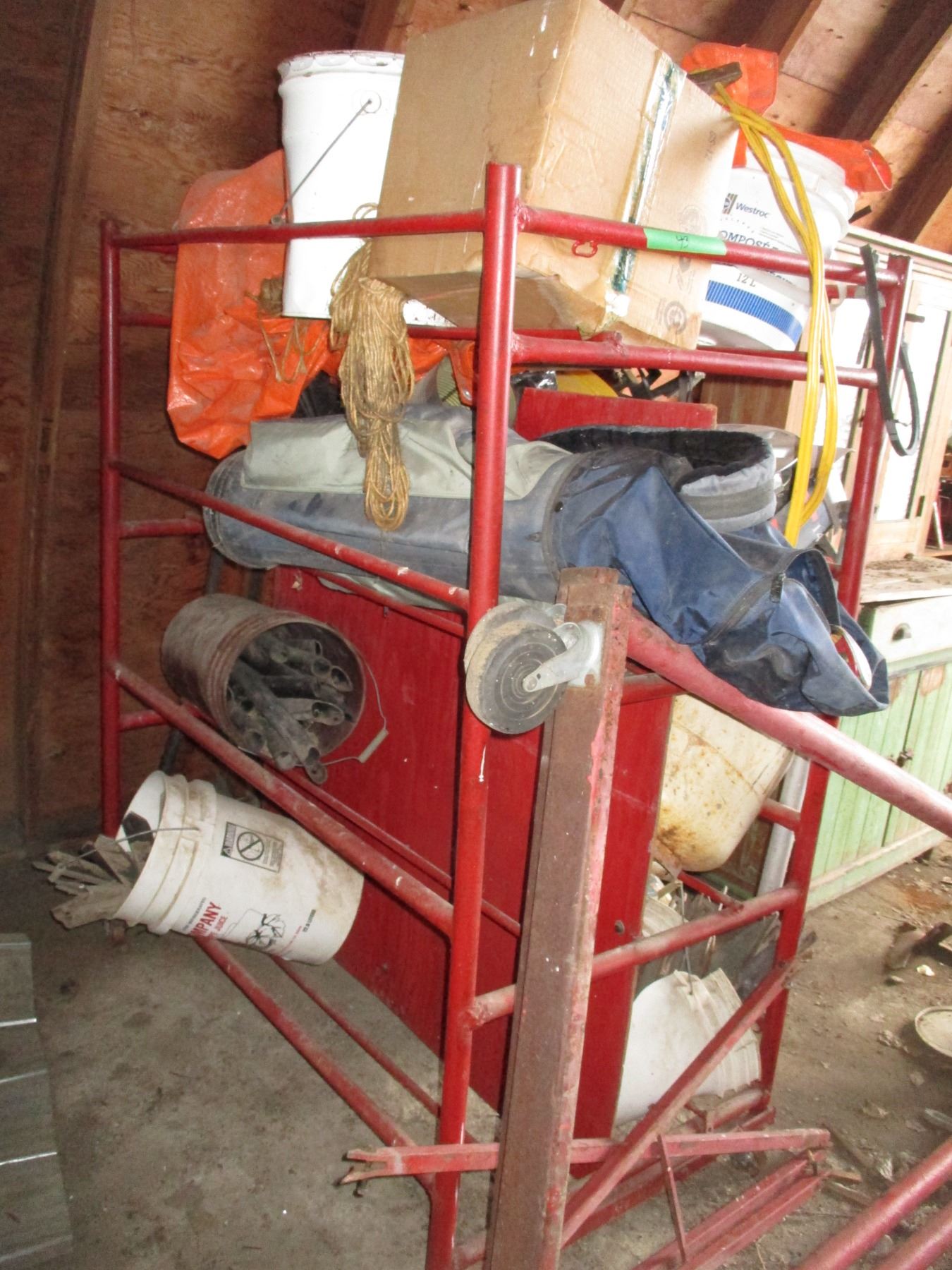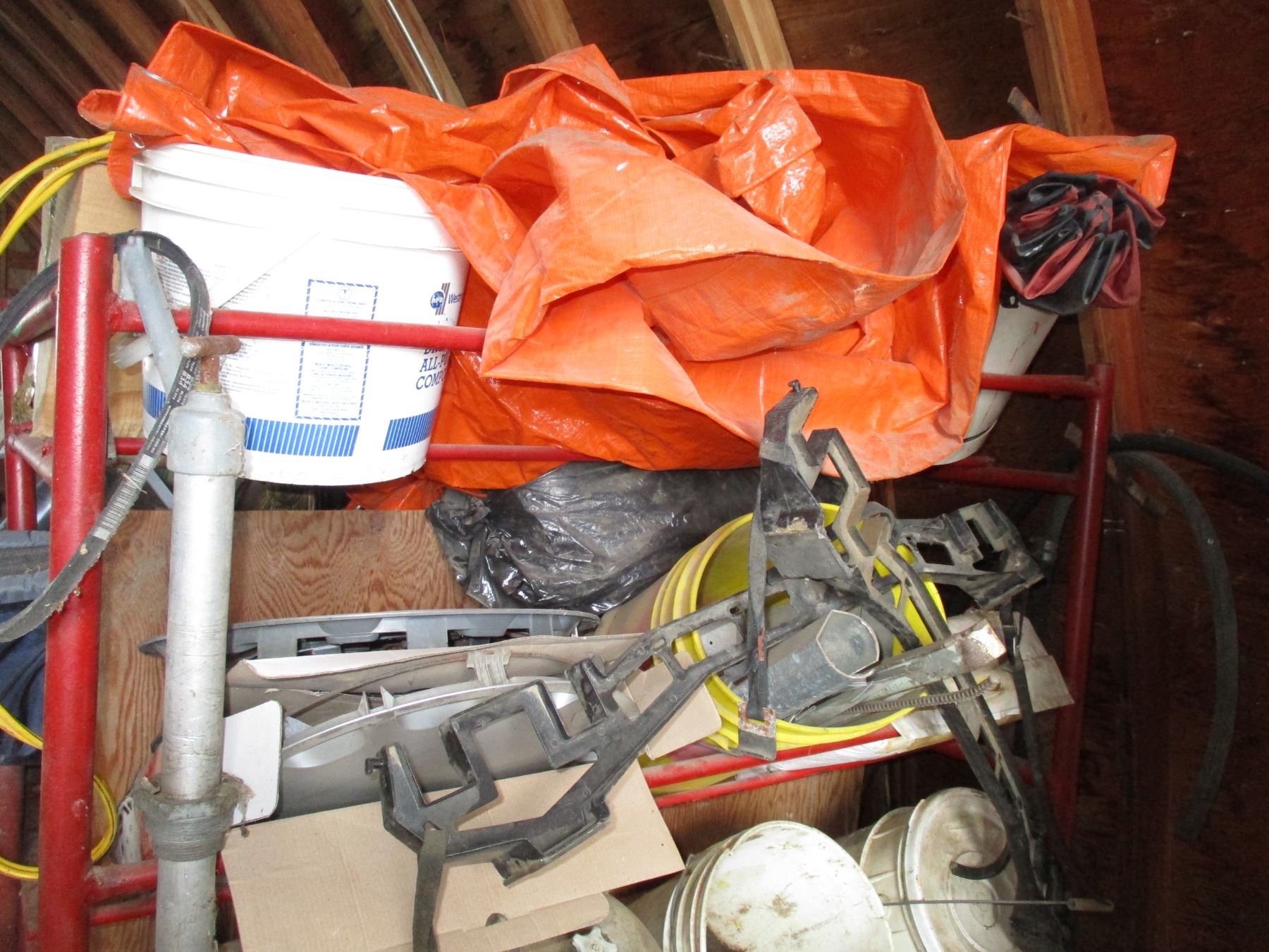 Storage rack stand on castors (with contents - hub caps, tarp, piping + misc) GREY PIPES NOT INCLUDE