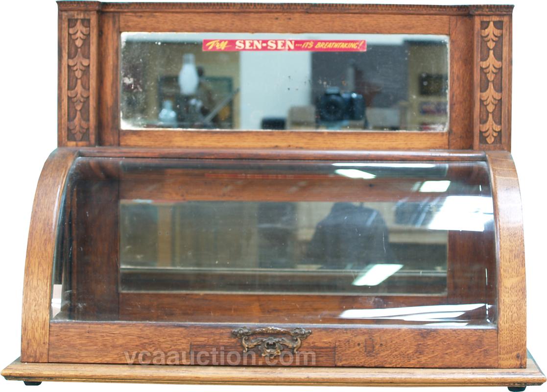 Store Countertop Try Sen-Sen Oak & Curved Beveled Glass Display Case w/ mirror marquee. Was originally from an early Edison cylinder case - 25" x 15" x 19" tall