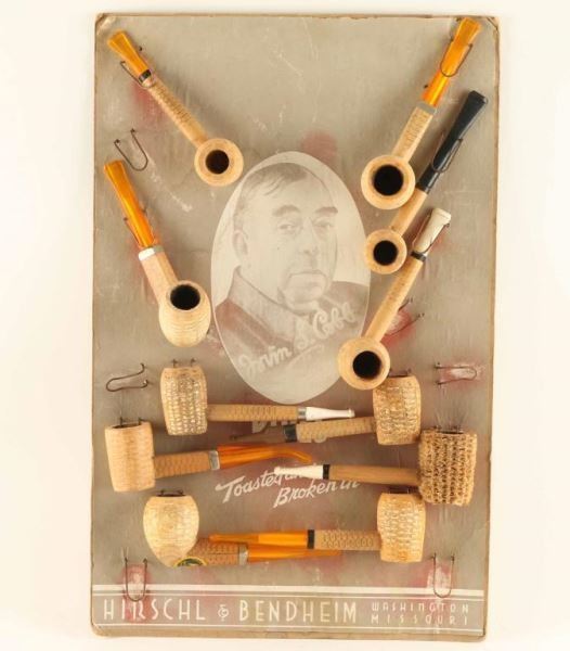 showing logo and name "HIRSCHL & BENDHEIM WASHINGTON/MISSOURI". Contains 11 pipes in their original holders with 7 empty spots. Good to very good condition with some fading. Circa 1920-50's. "Hillbilly-Cool"