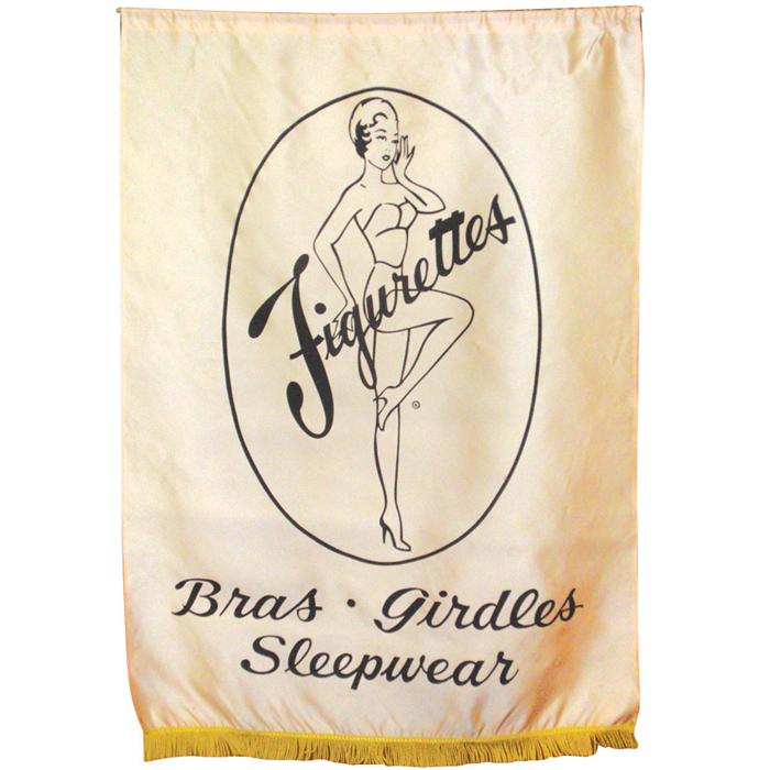 Store banner for Figurettes Bras, Girdles & Sleepwear, fabric, c.1940s, VG cond, 50"H x 34"L.